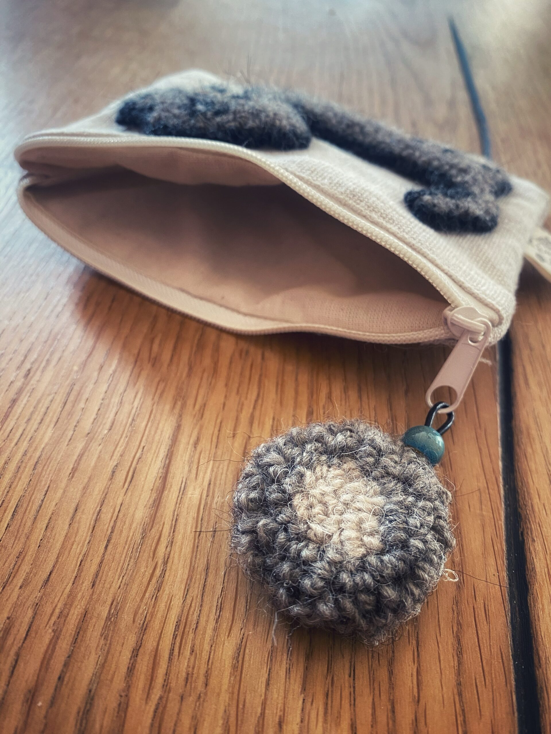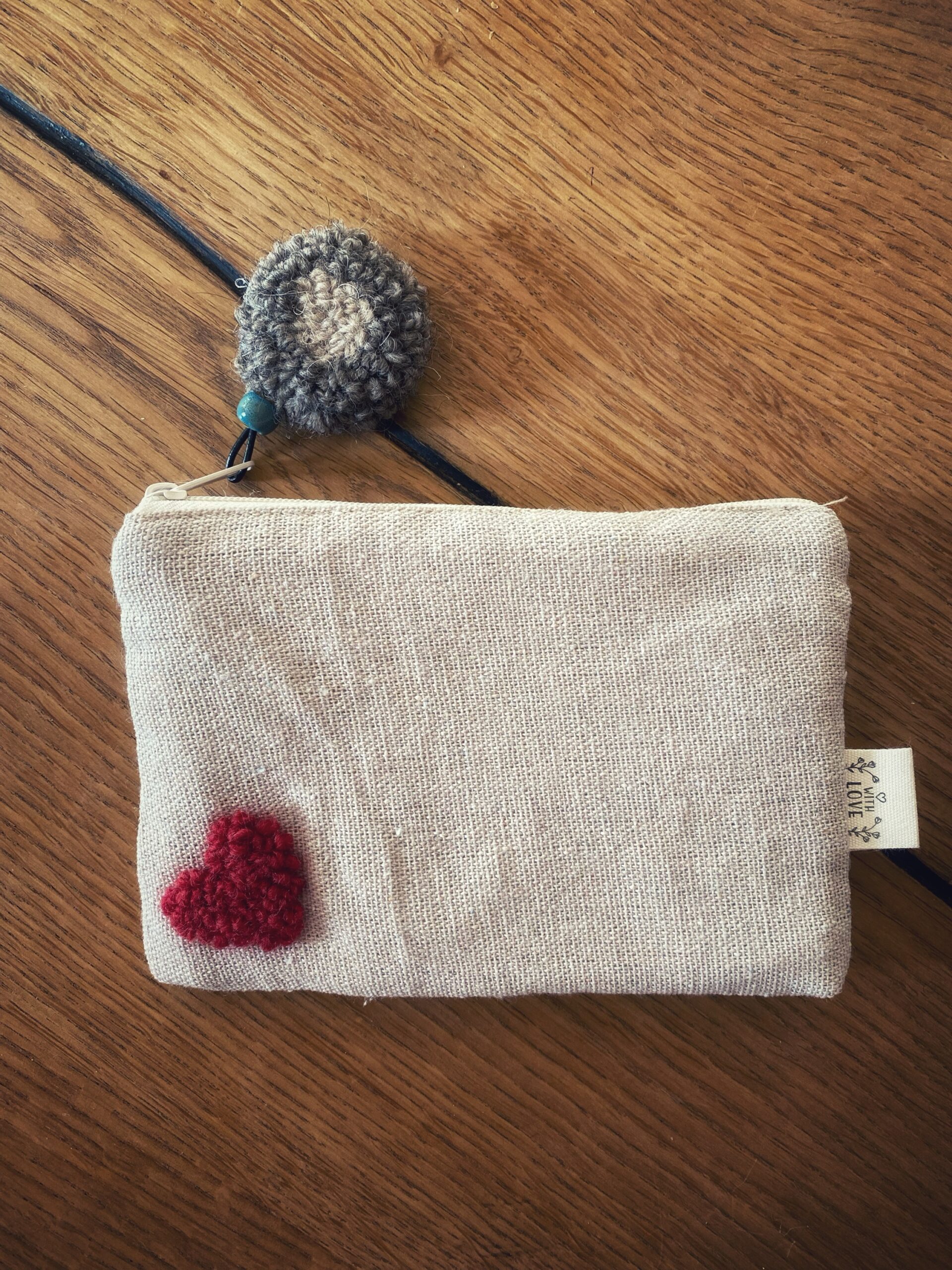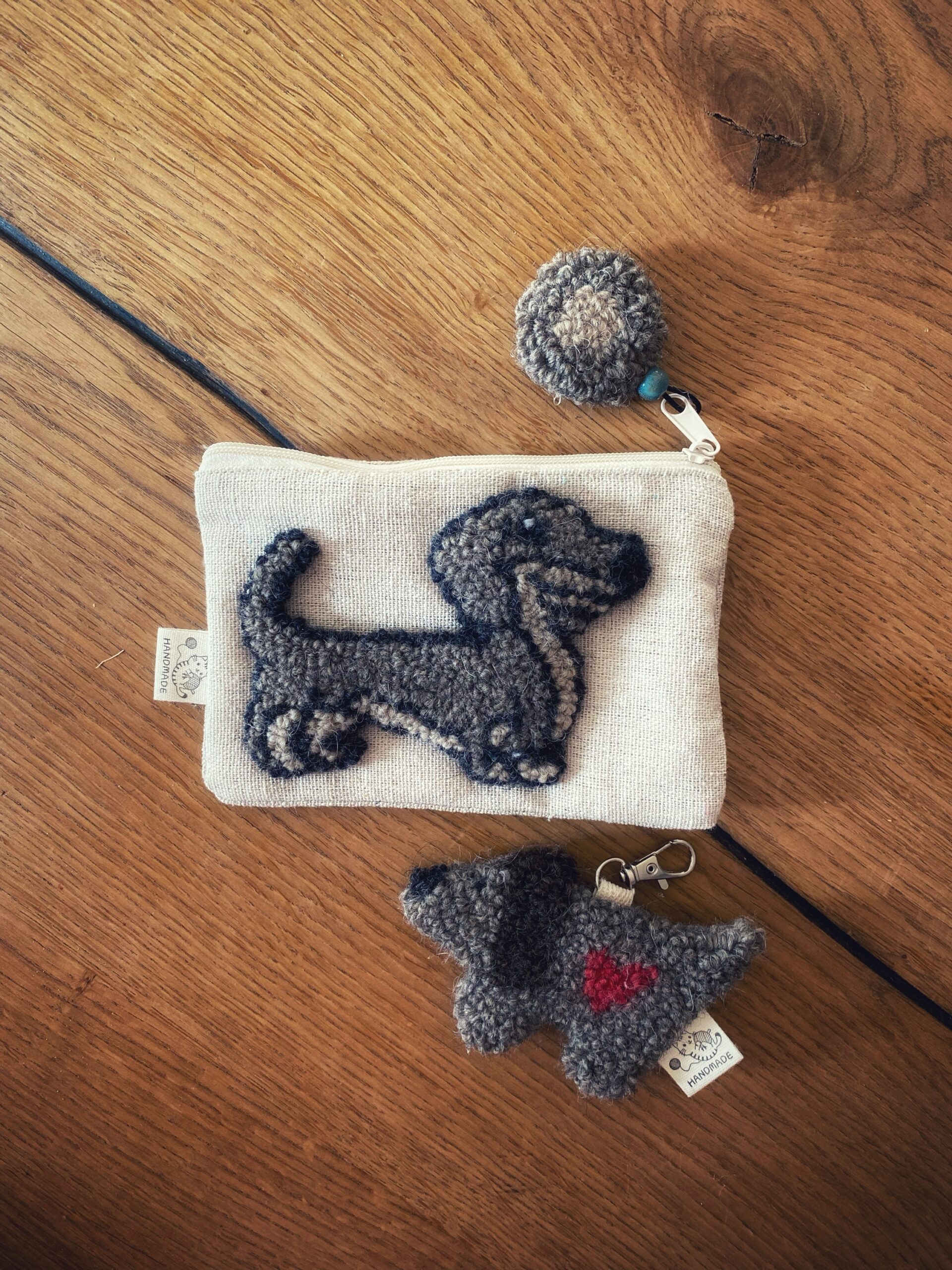 Borselli e portachiavi ricamati a mano con tecnica punch needle , lana su tela in cotone .