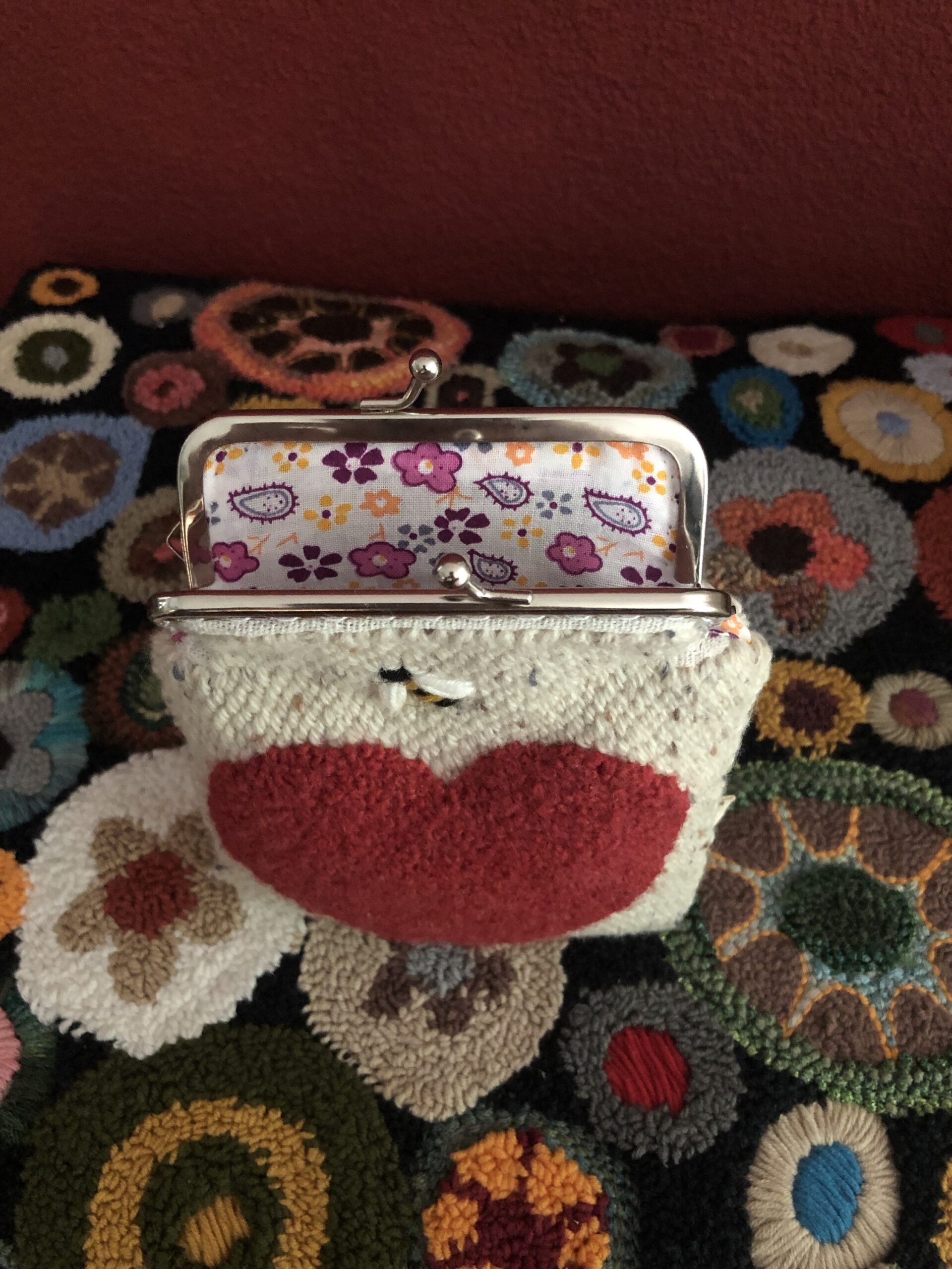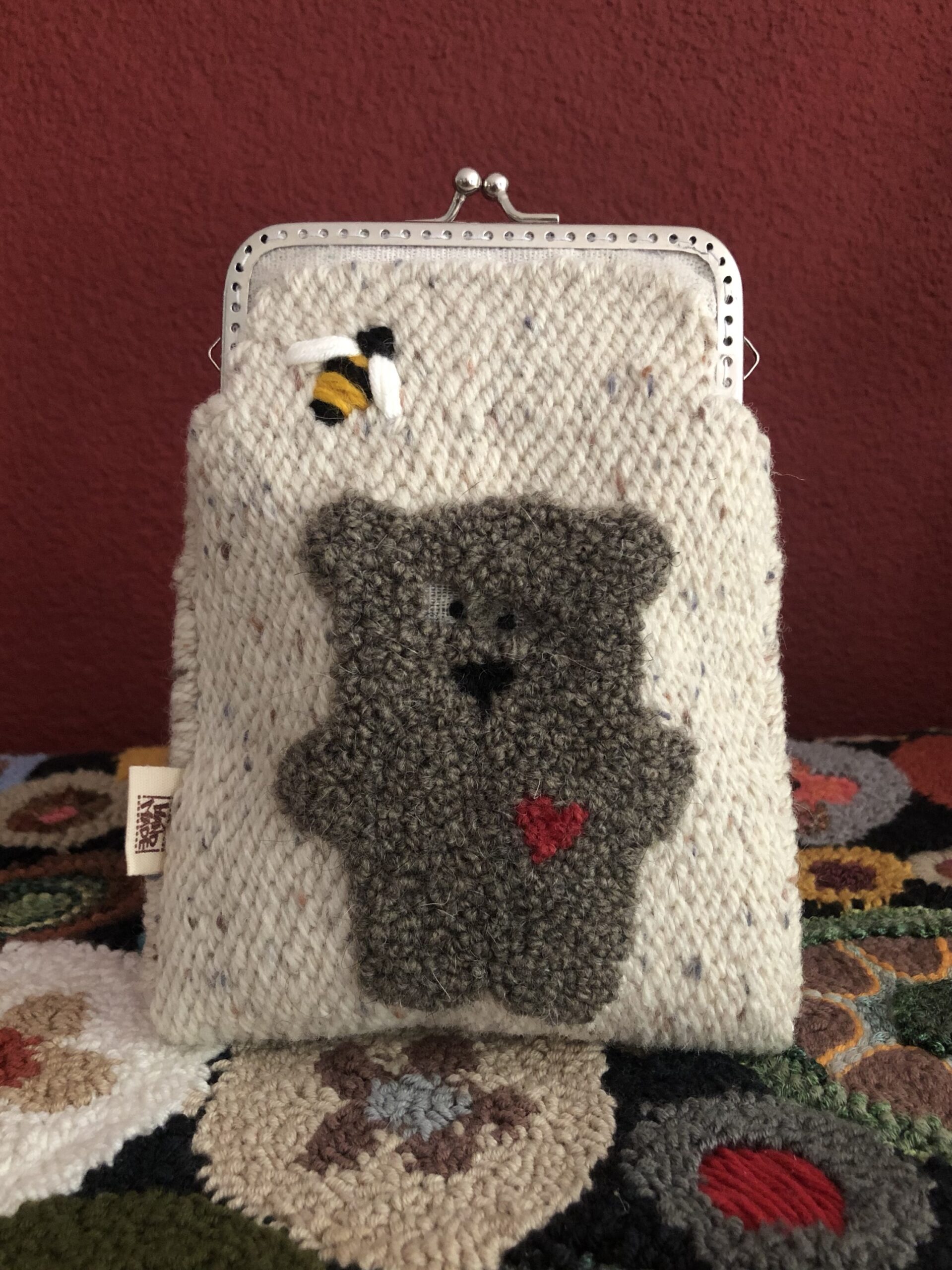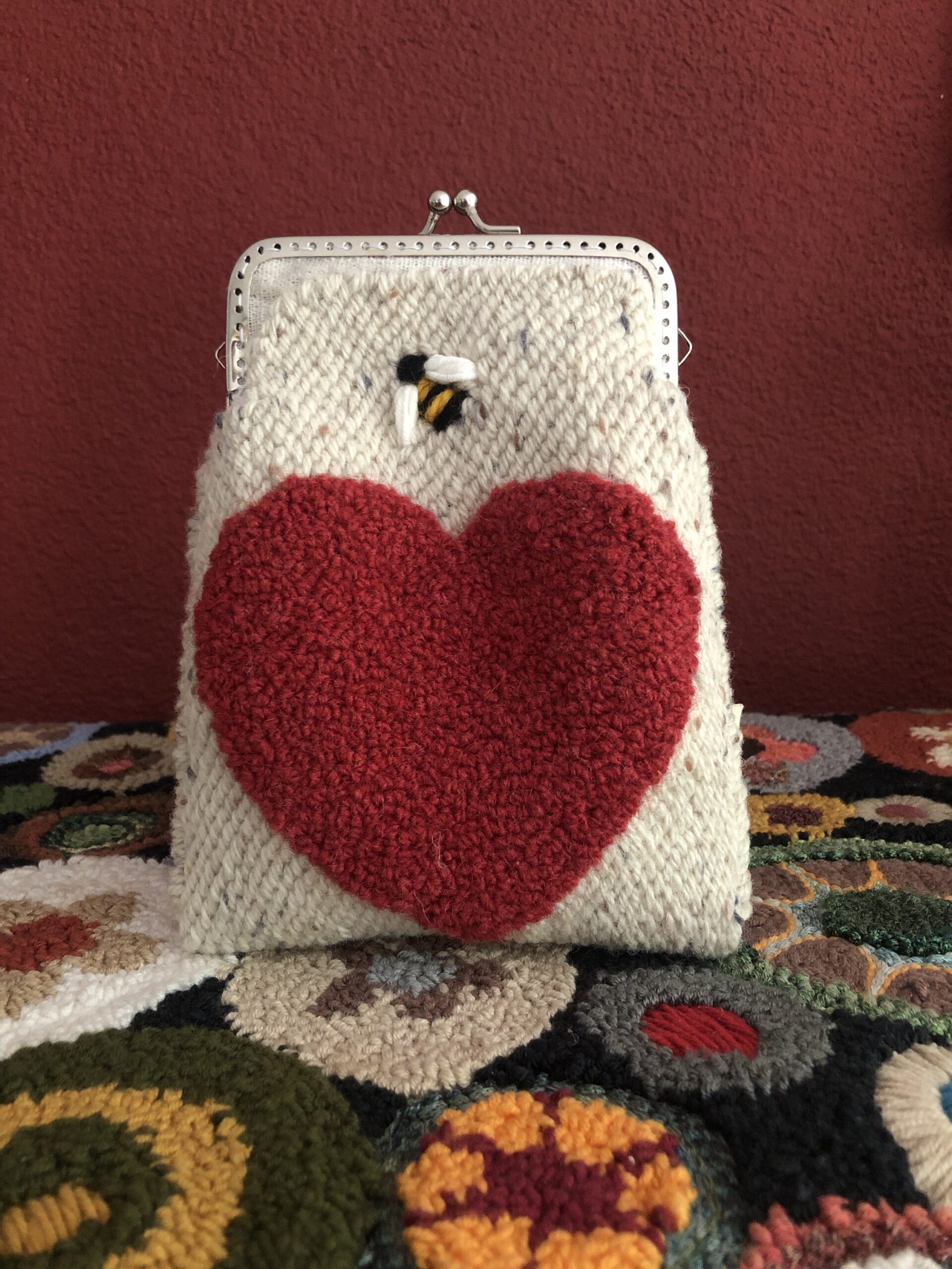 Borsetta ricamata in lana e cotone su tela , secondo tecnica punch needle .