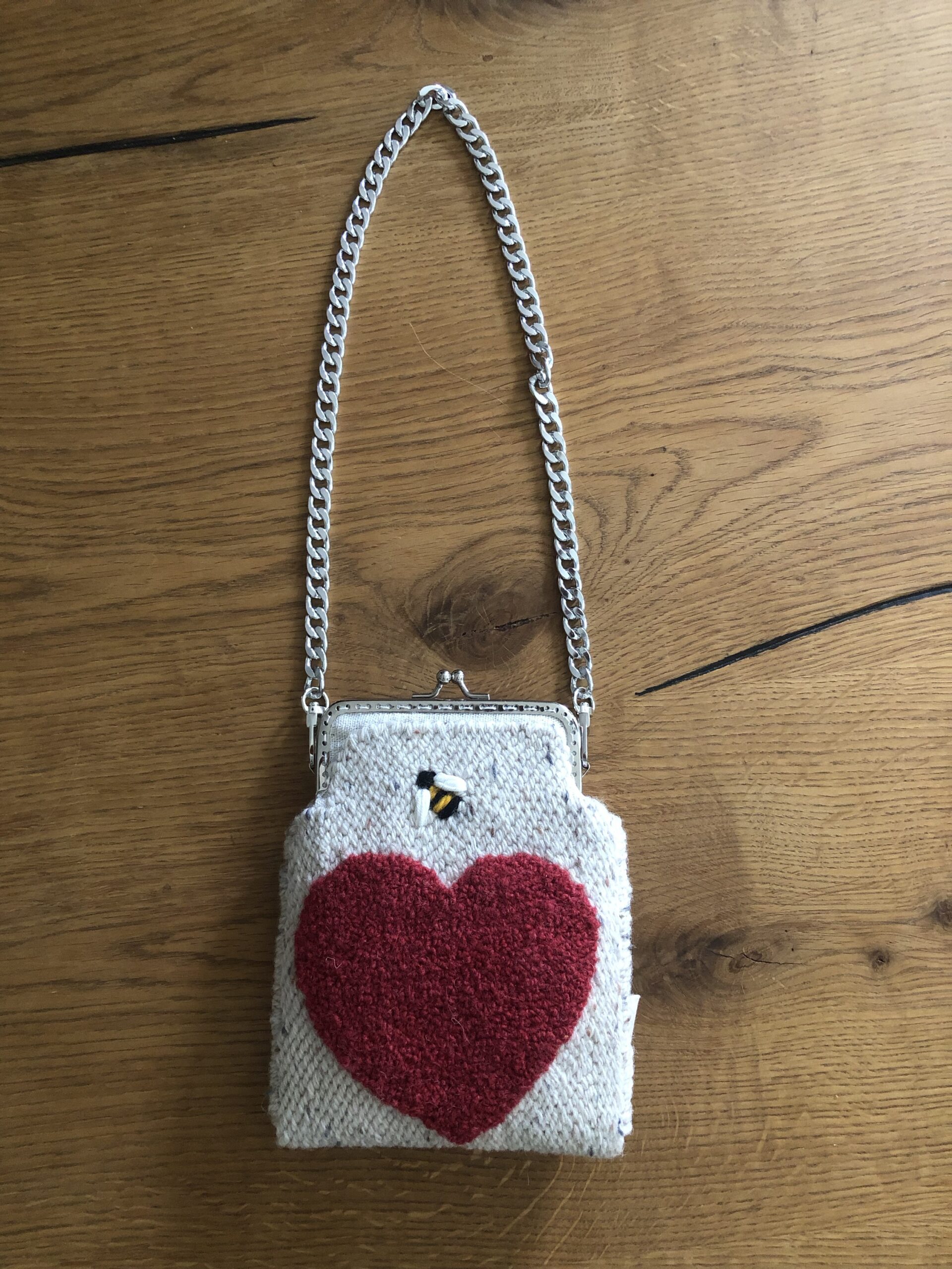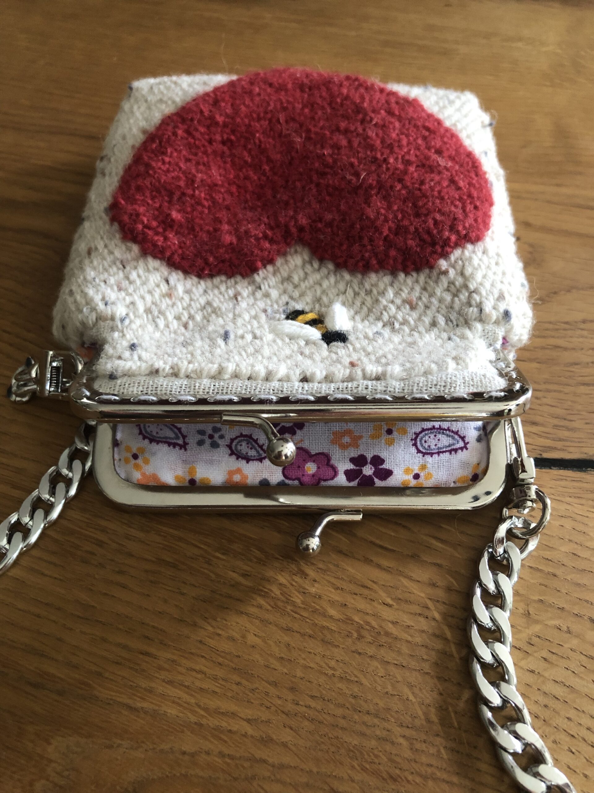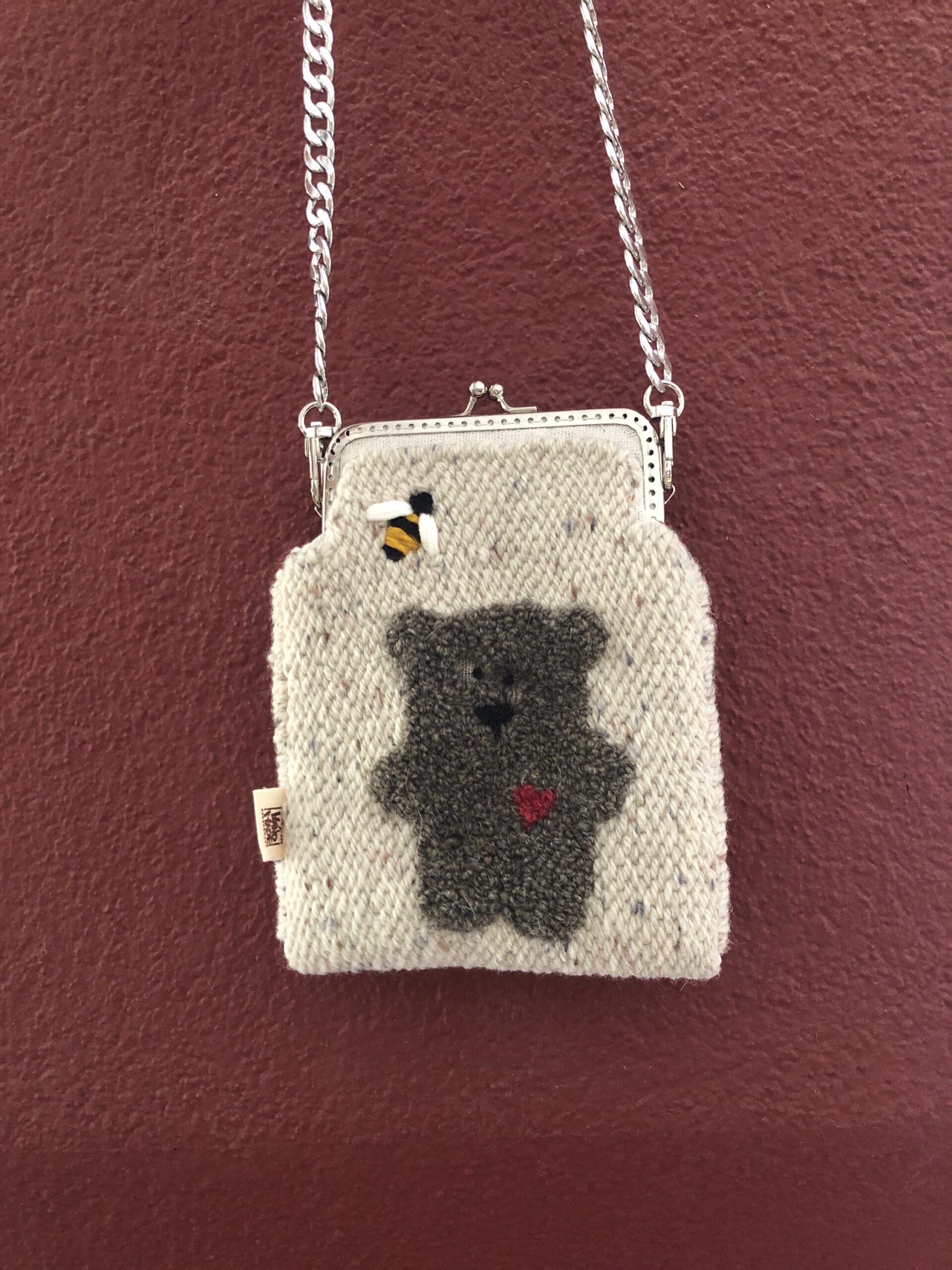 Borsetta ricamata in lana e cotone su tela , secondo tecnica punch needle .