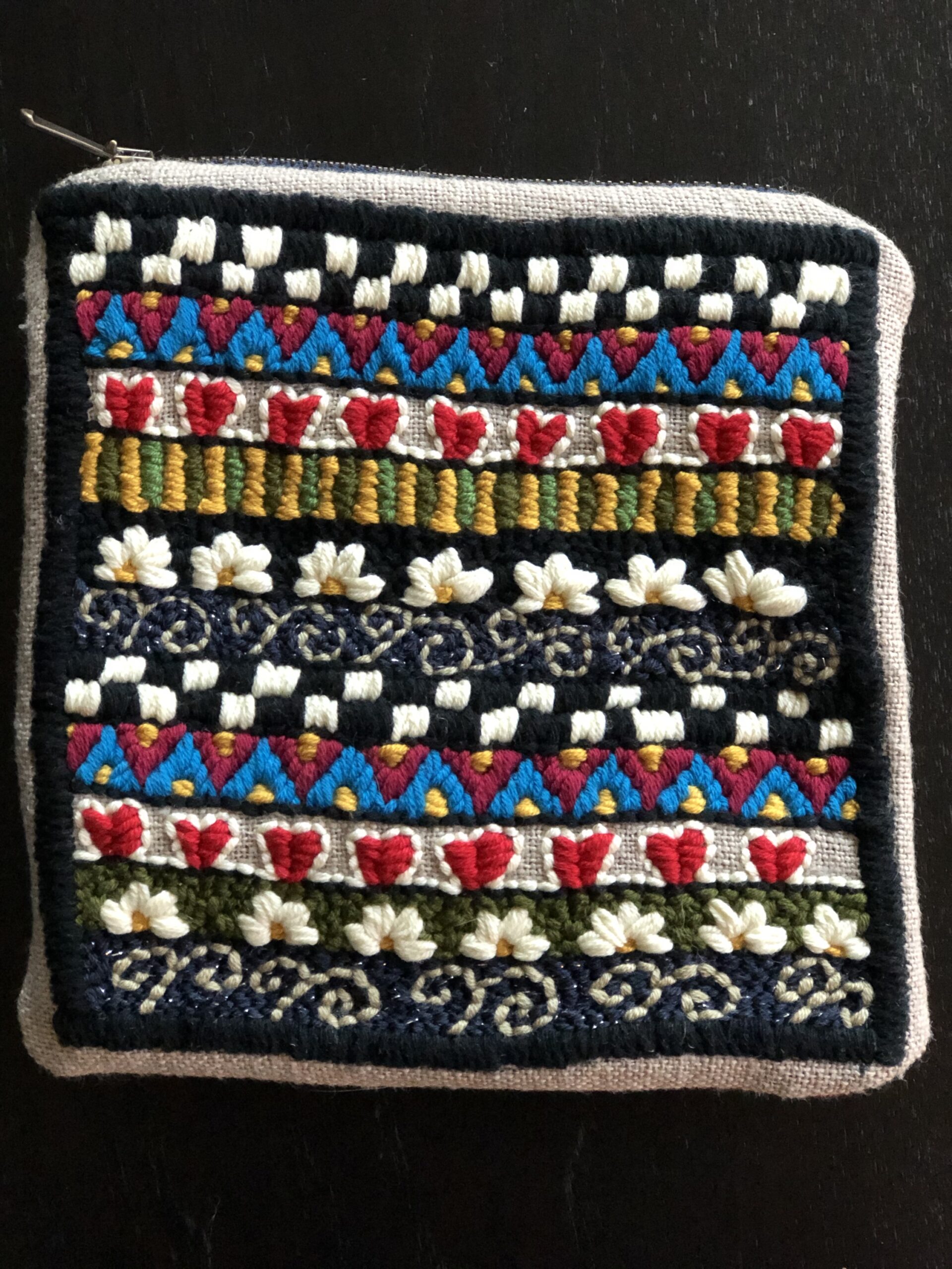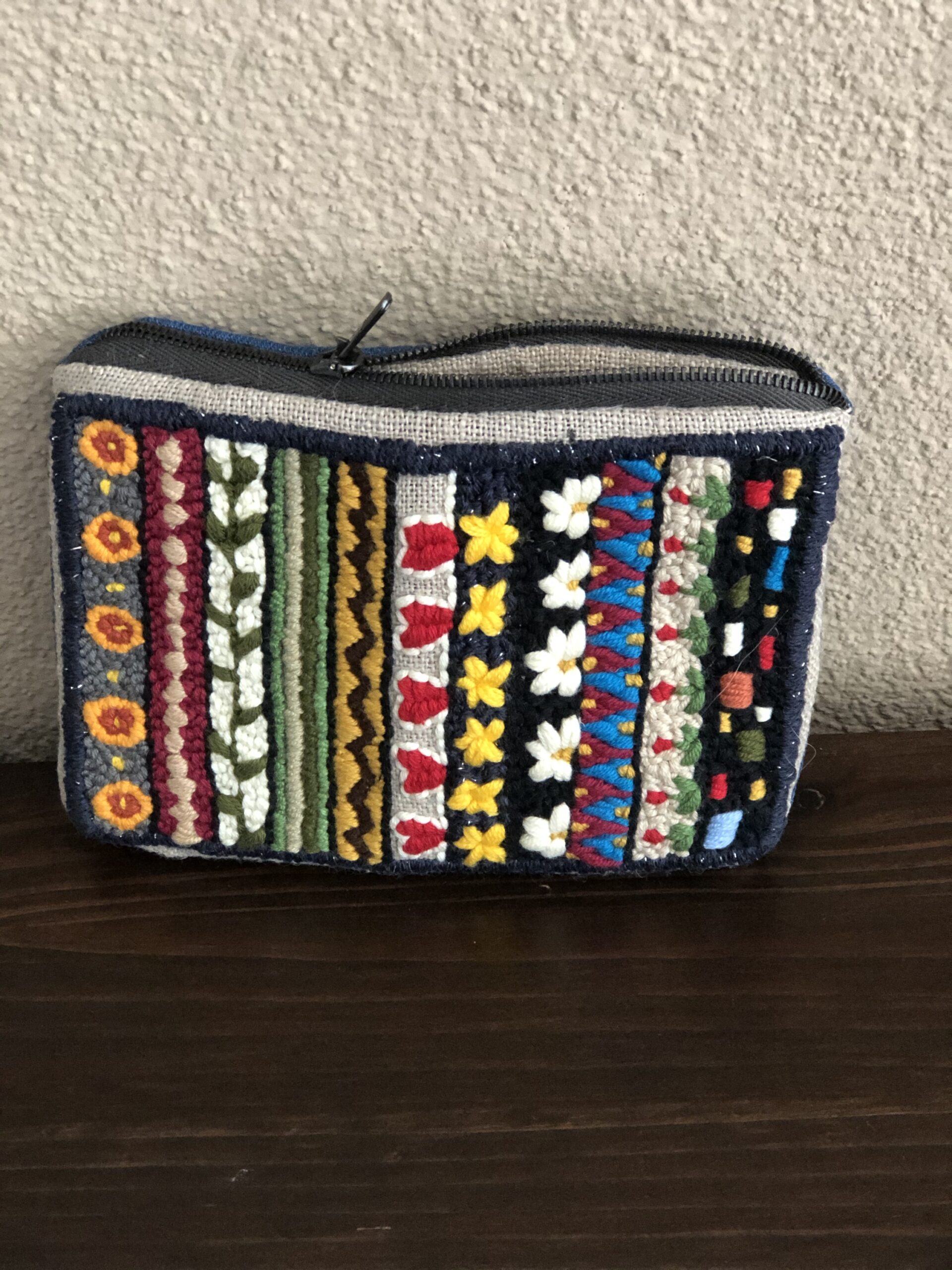 Astuccio con cerniera ricamato in lana su tela in cotone