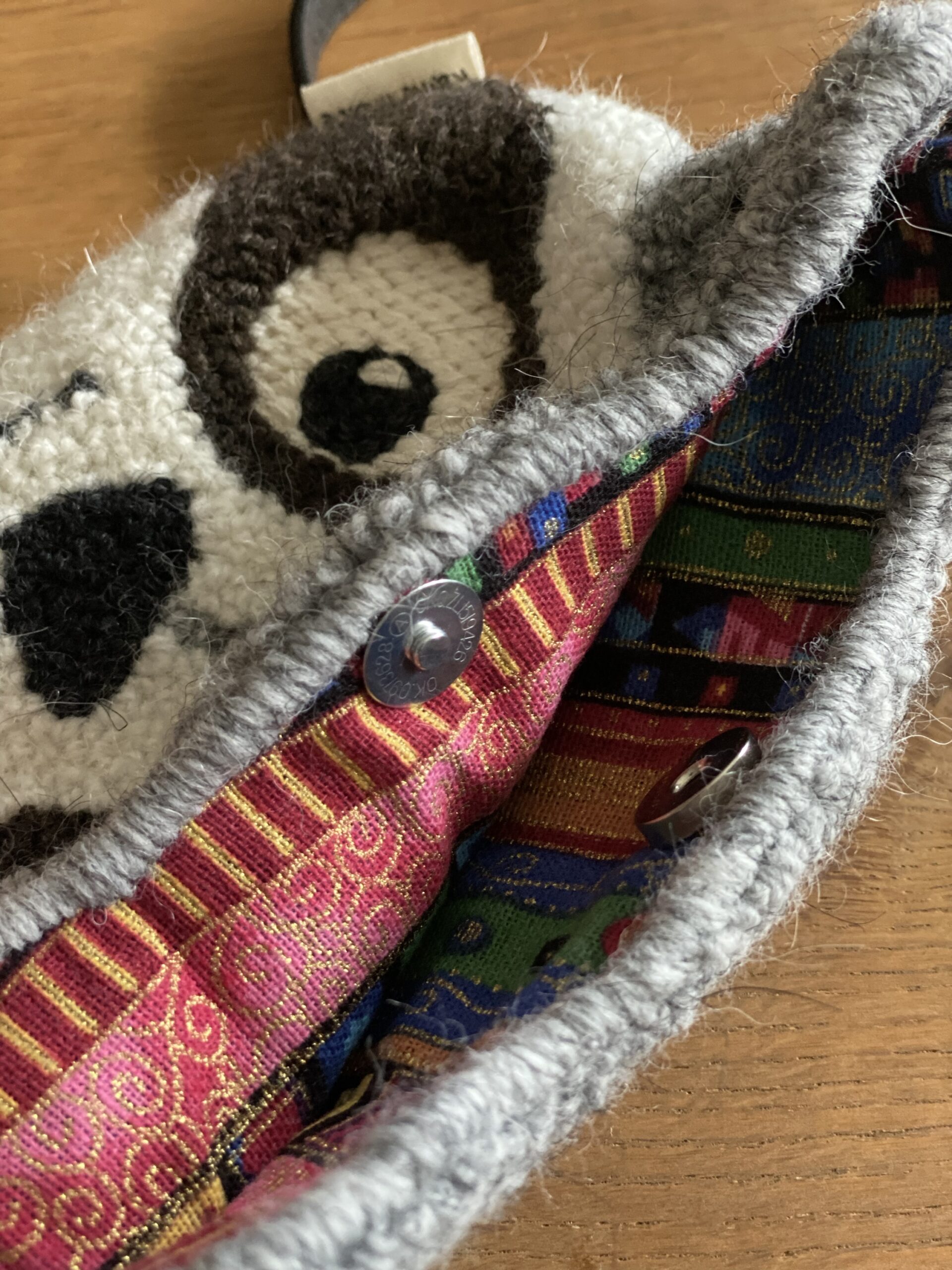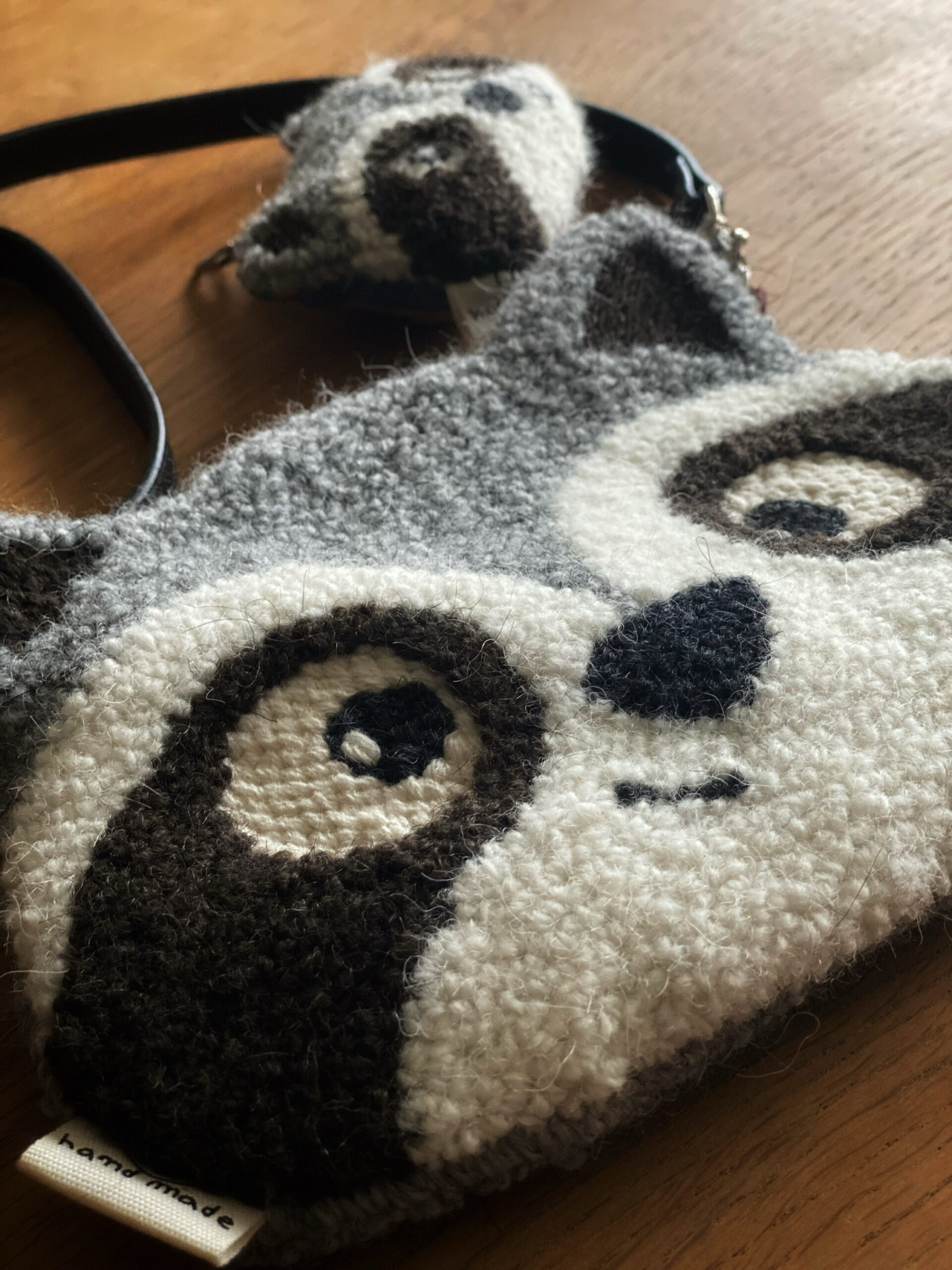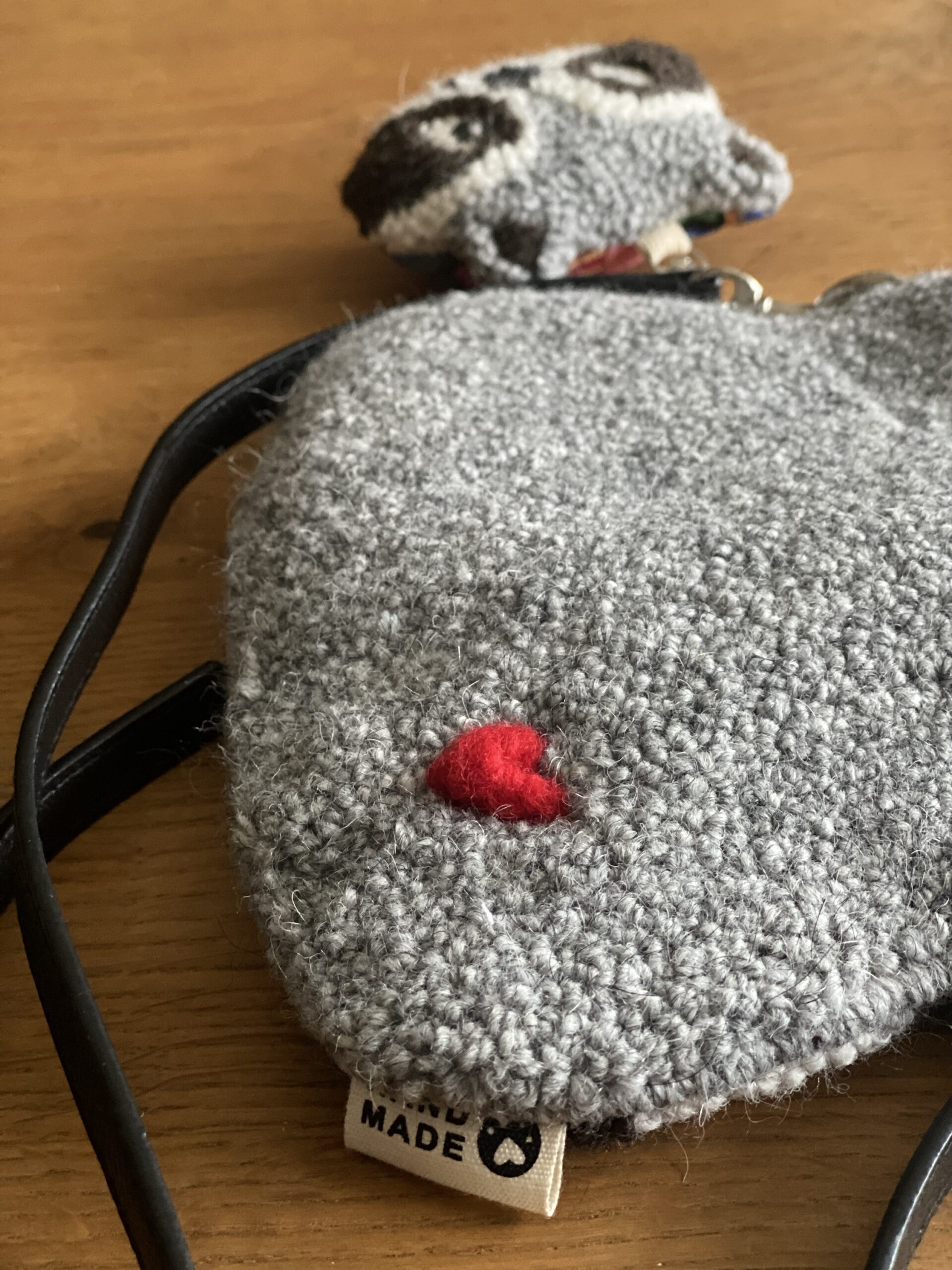 Borsetta ricamata a mano su tela di lino con tecnica punch needle .