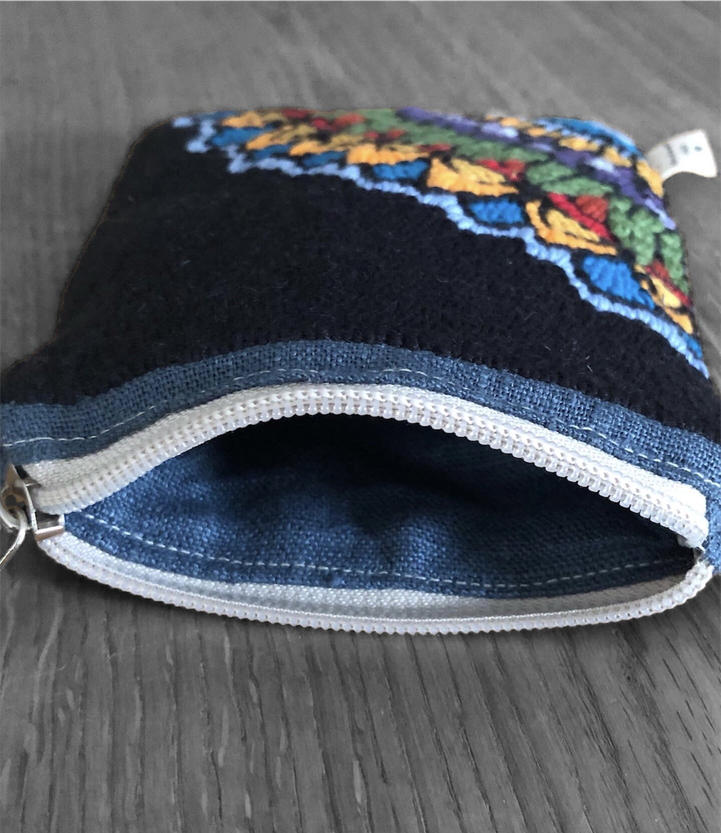 Astuccio con cerniera ricamato in lana su tela in cotone
