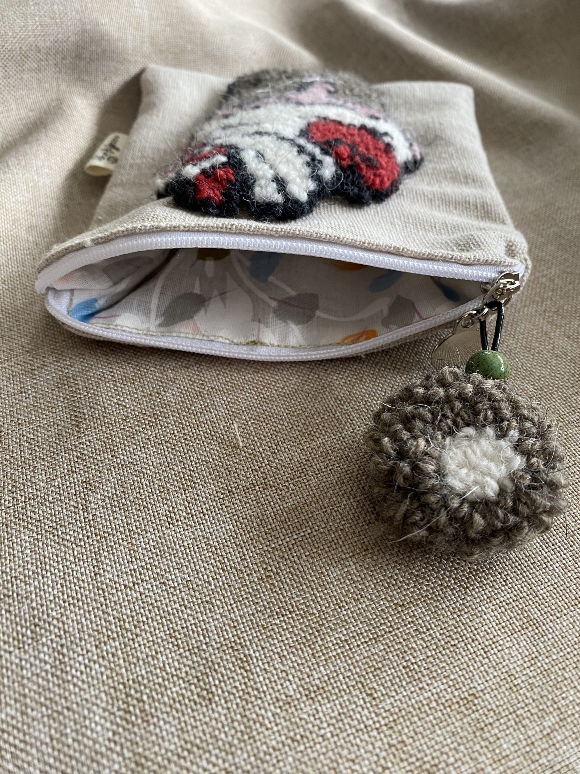 Astuccio con cerniera ricamato in lana su tela in cotone