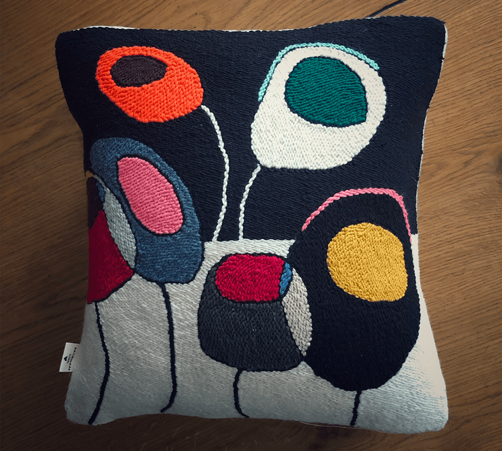 Cuscino ricamato a mano con lane e prodotti naturali, completamente sfoderabile.