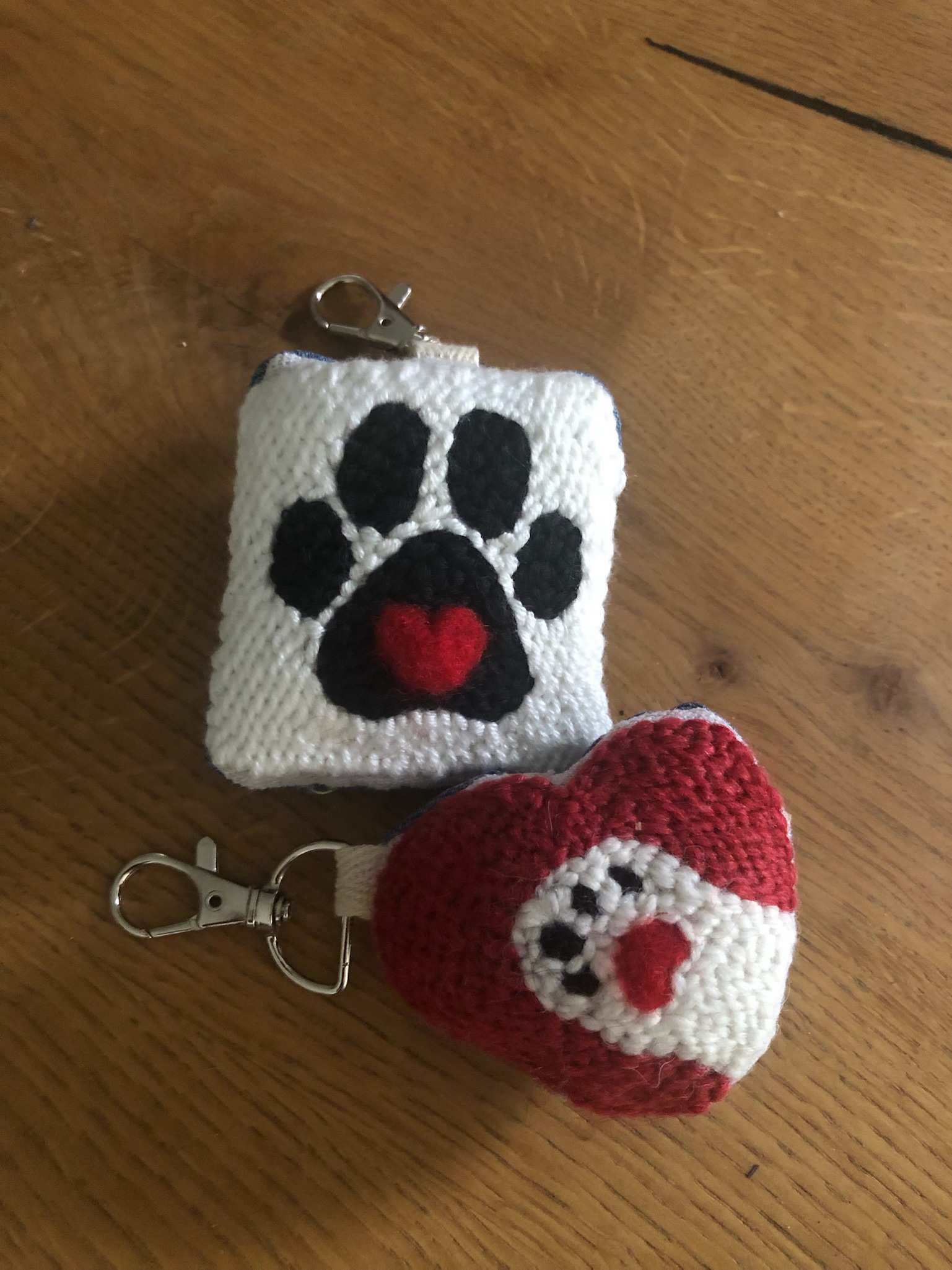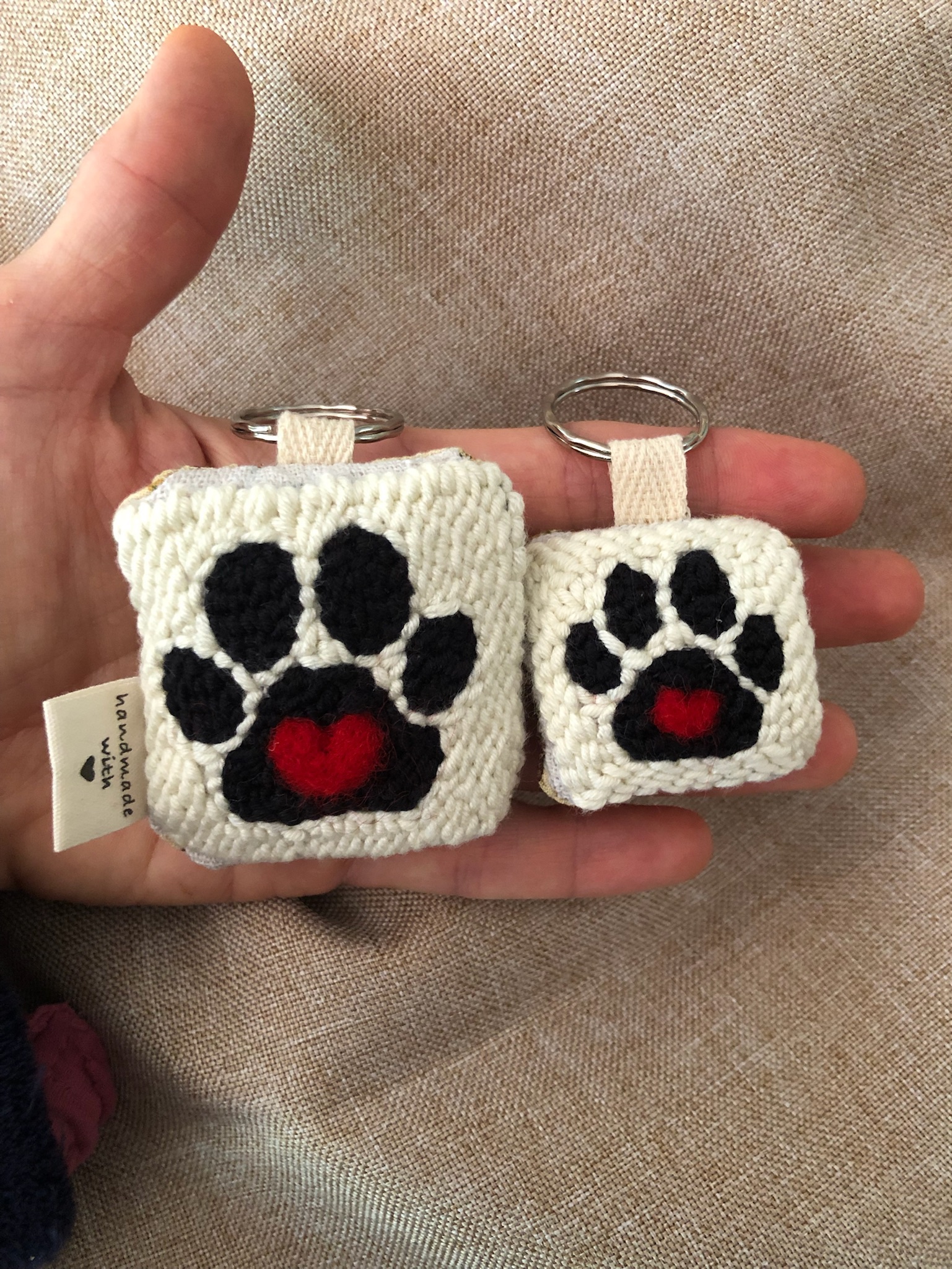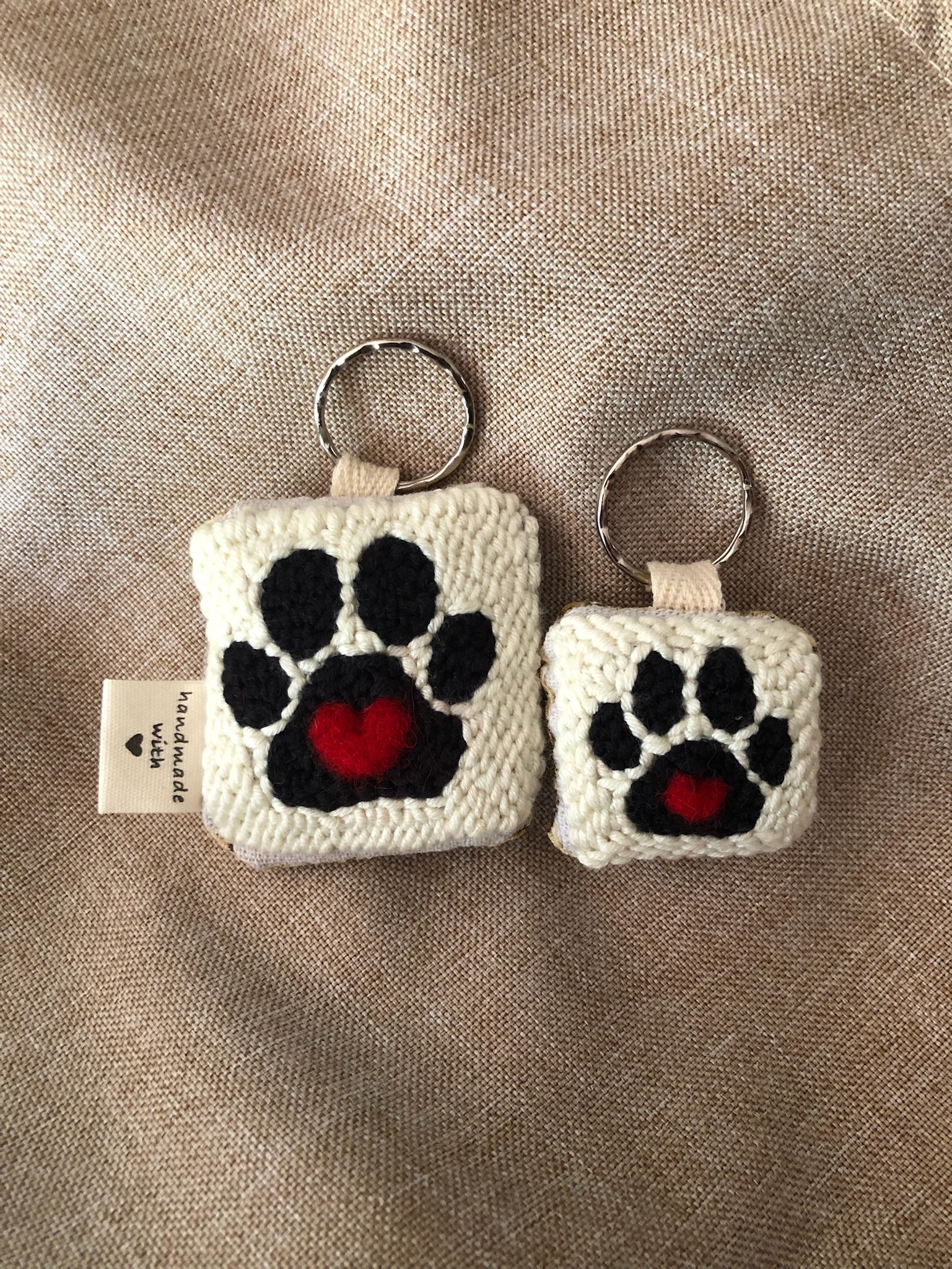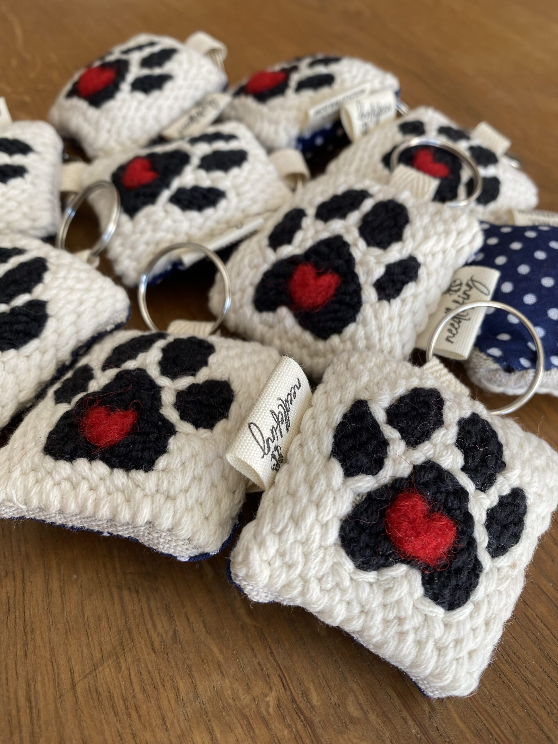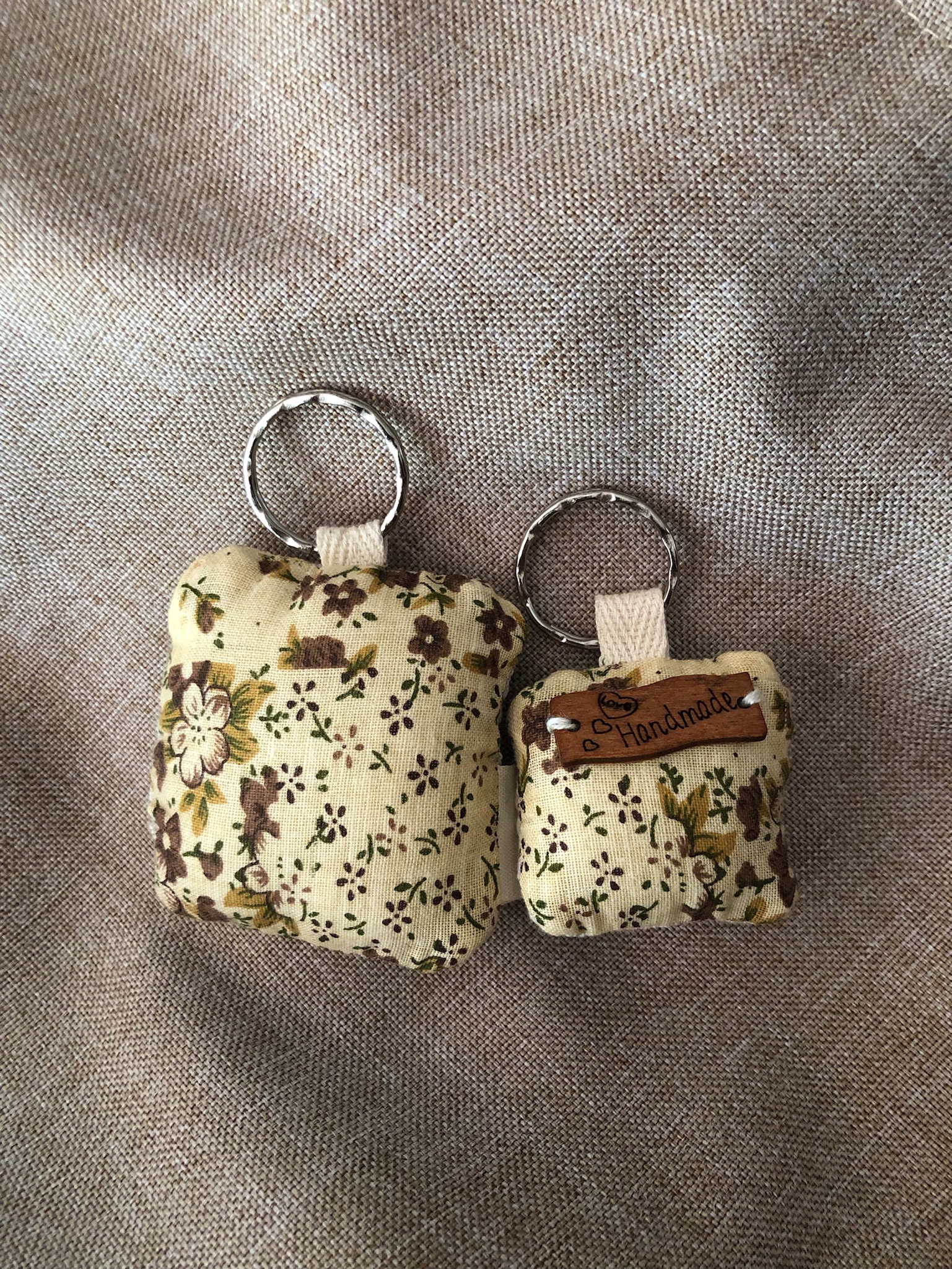 Portachiavi ricamati a mano su tela di lino.