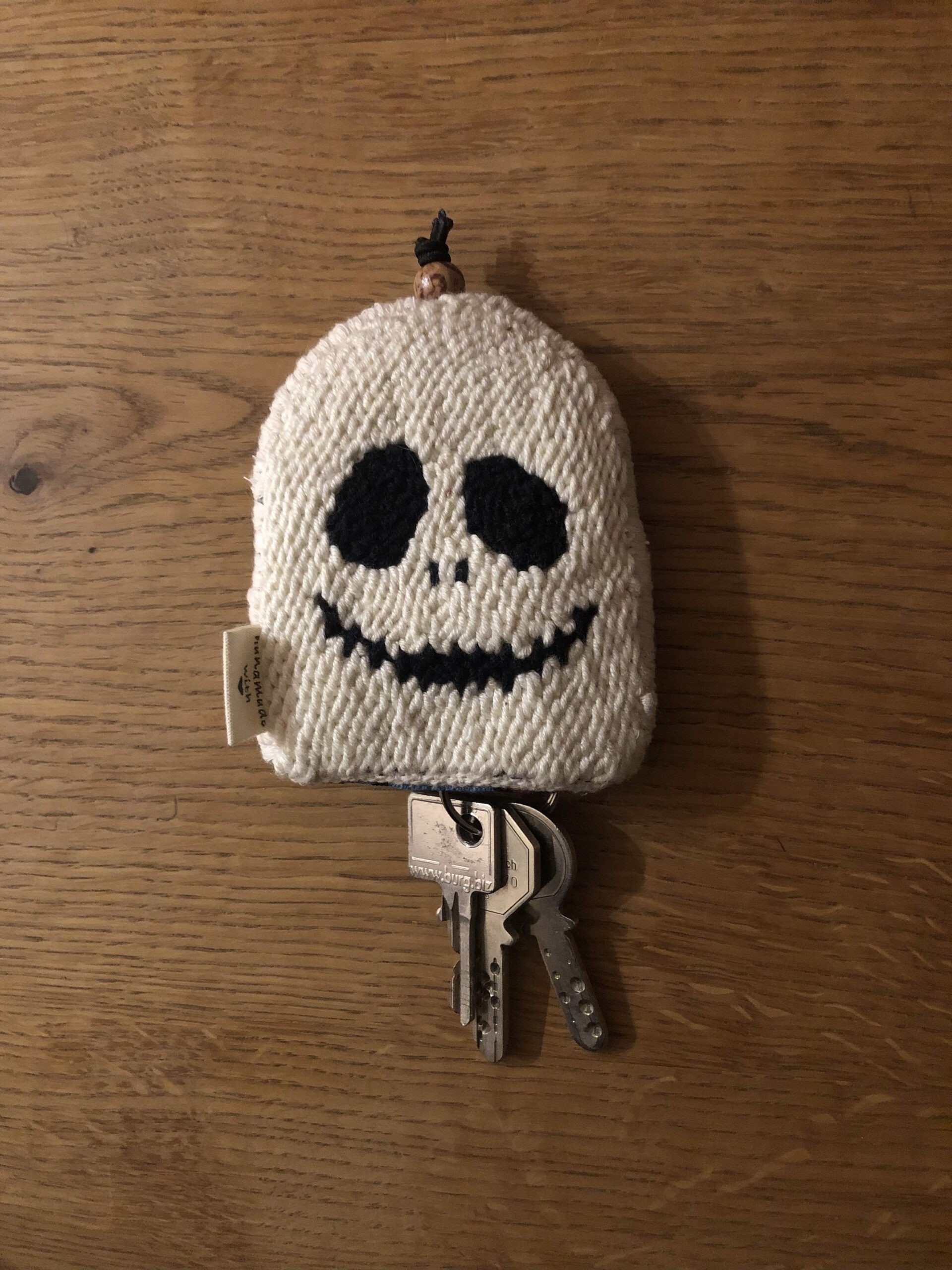Portachiavi ricamati a mano su tela di lino.