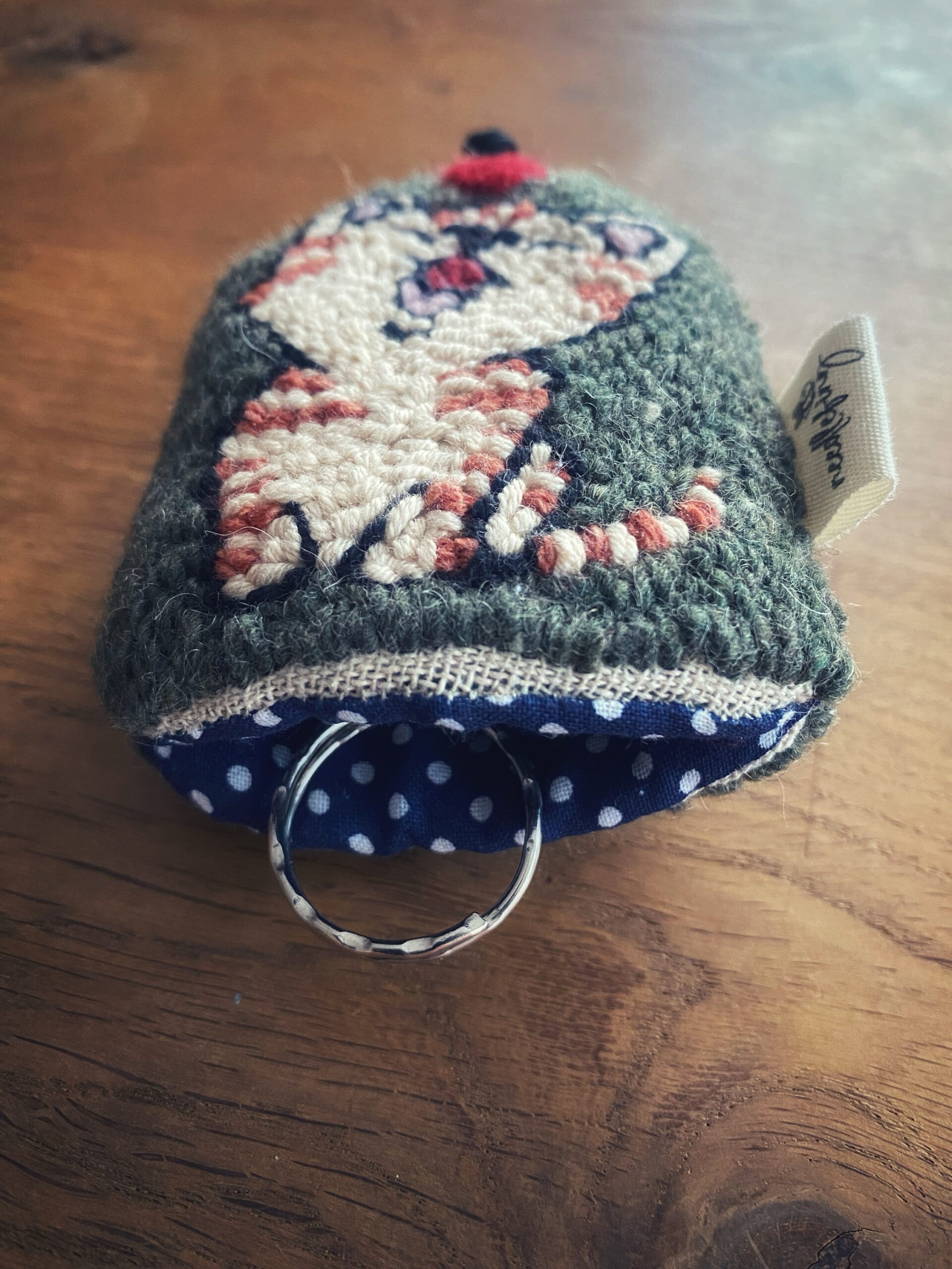 Portachiavi ricamati a mano su tela di lino.