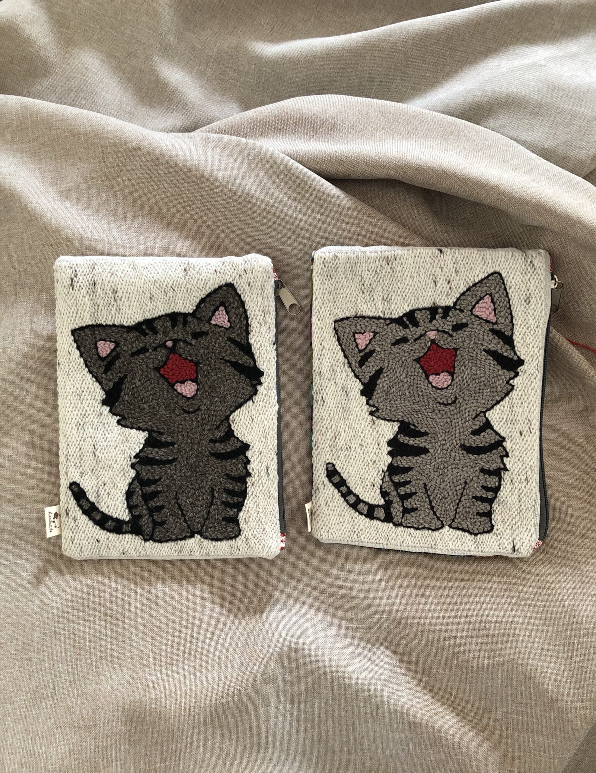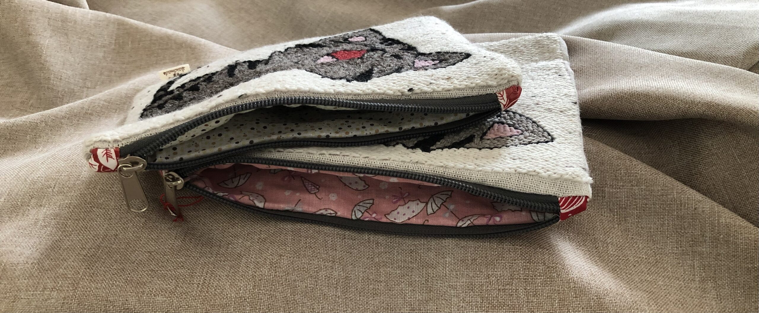 Astuccio con cerniera ricamato in lana su tela in cotone 21×16 cm