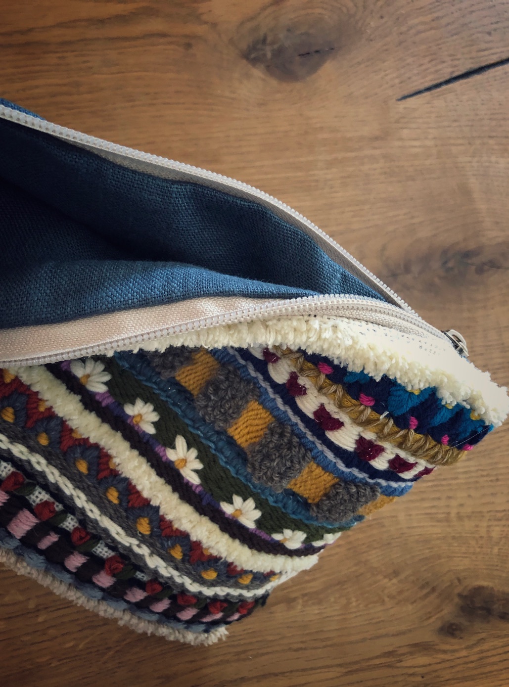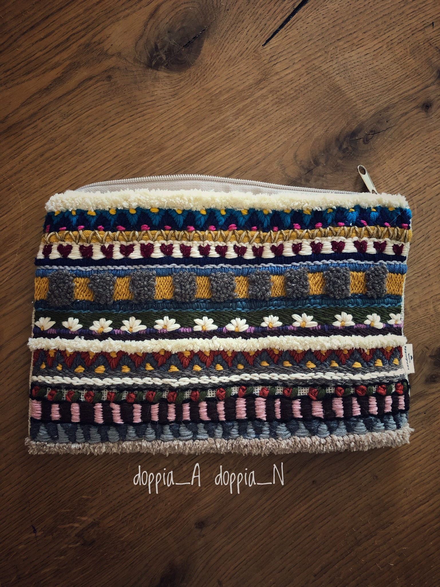 Astuccio con cerniera ricamato in lana su tela in cotone