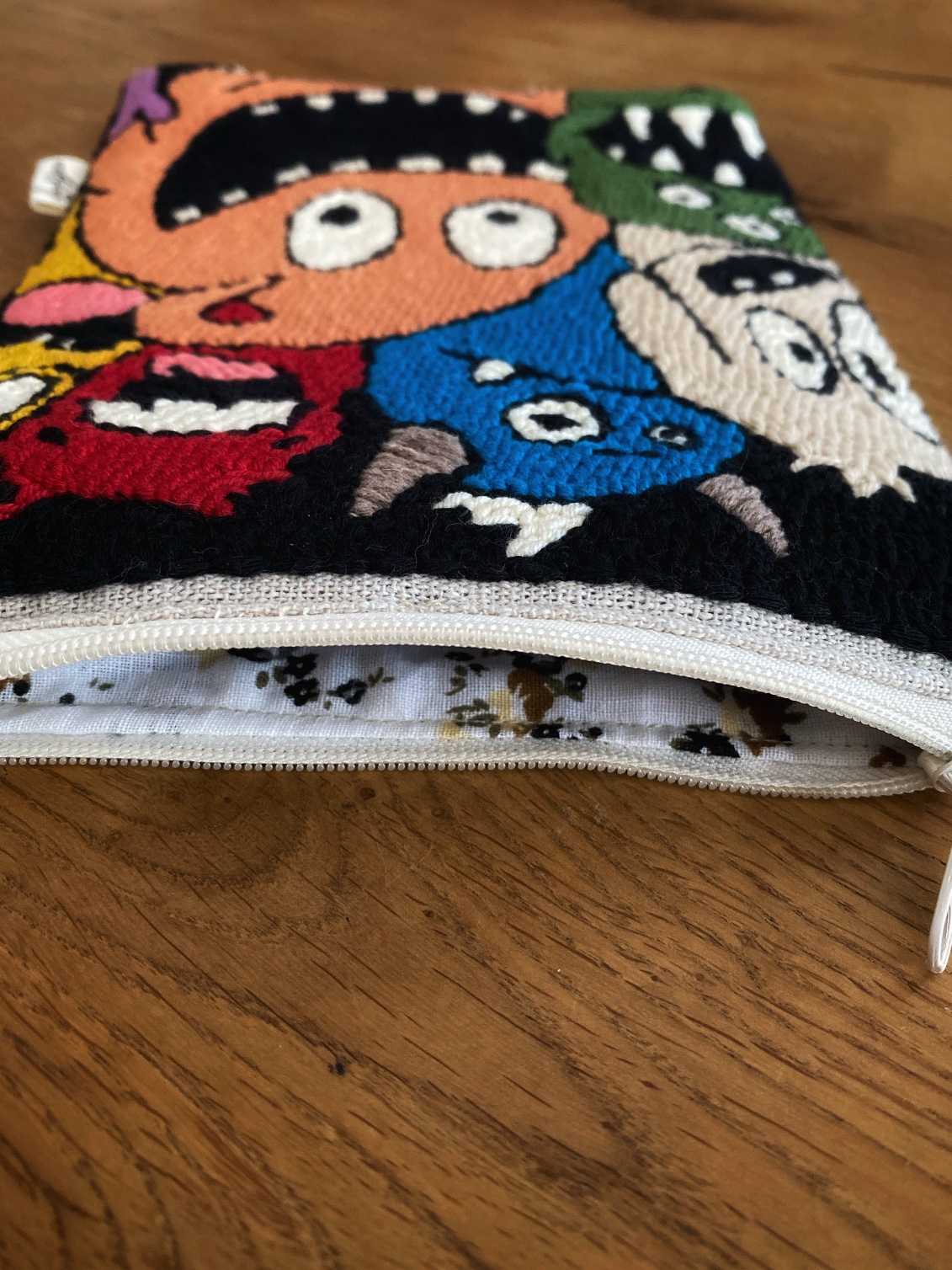 Astuccio con cerniera ricamato in lana su tela in cotone
