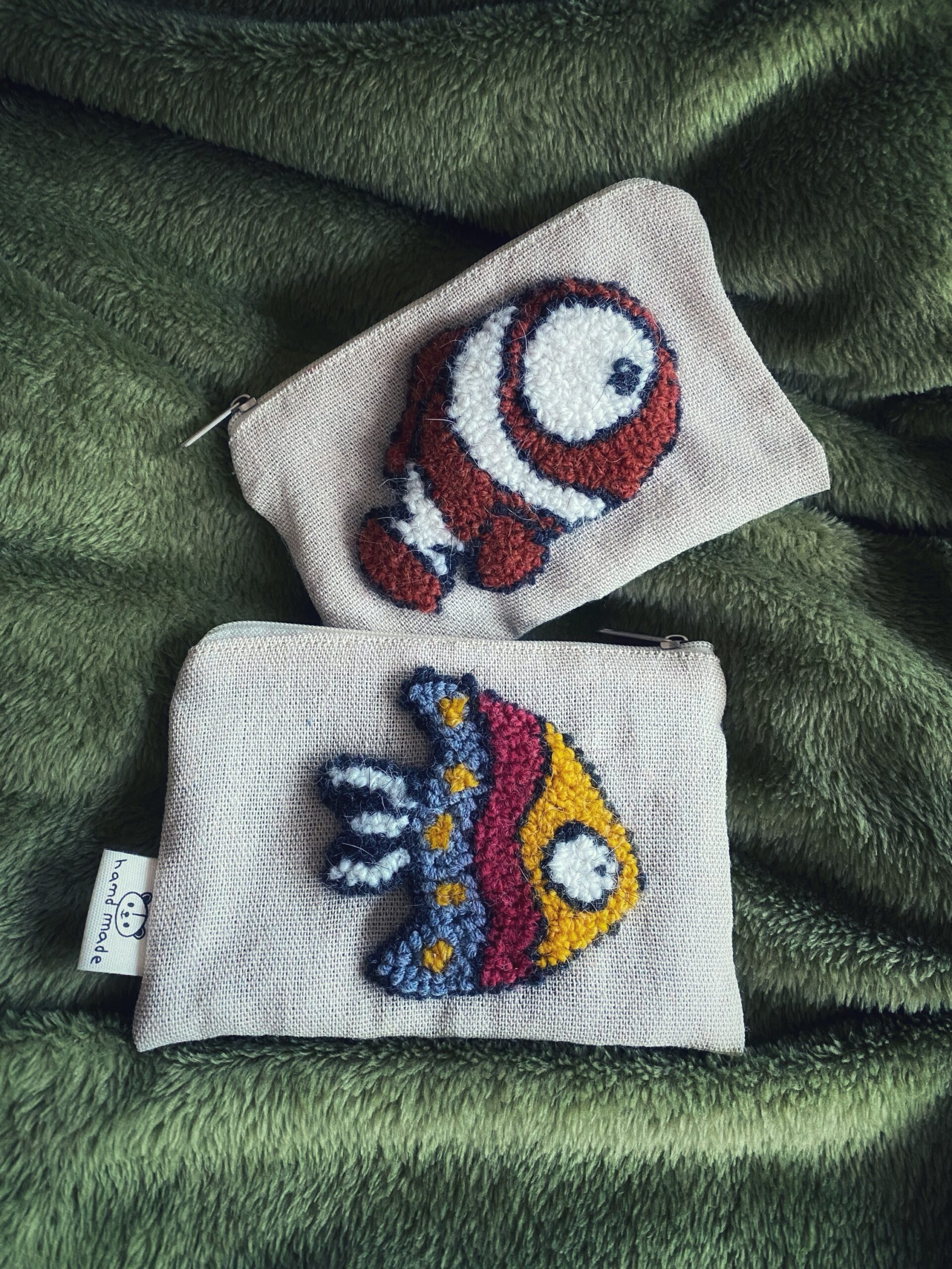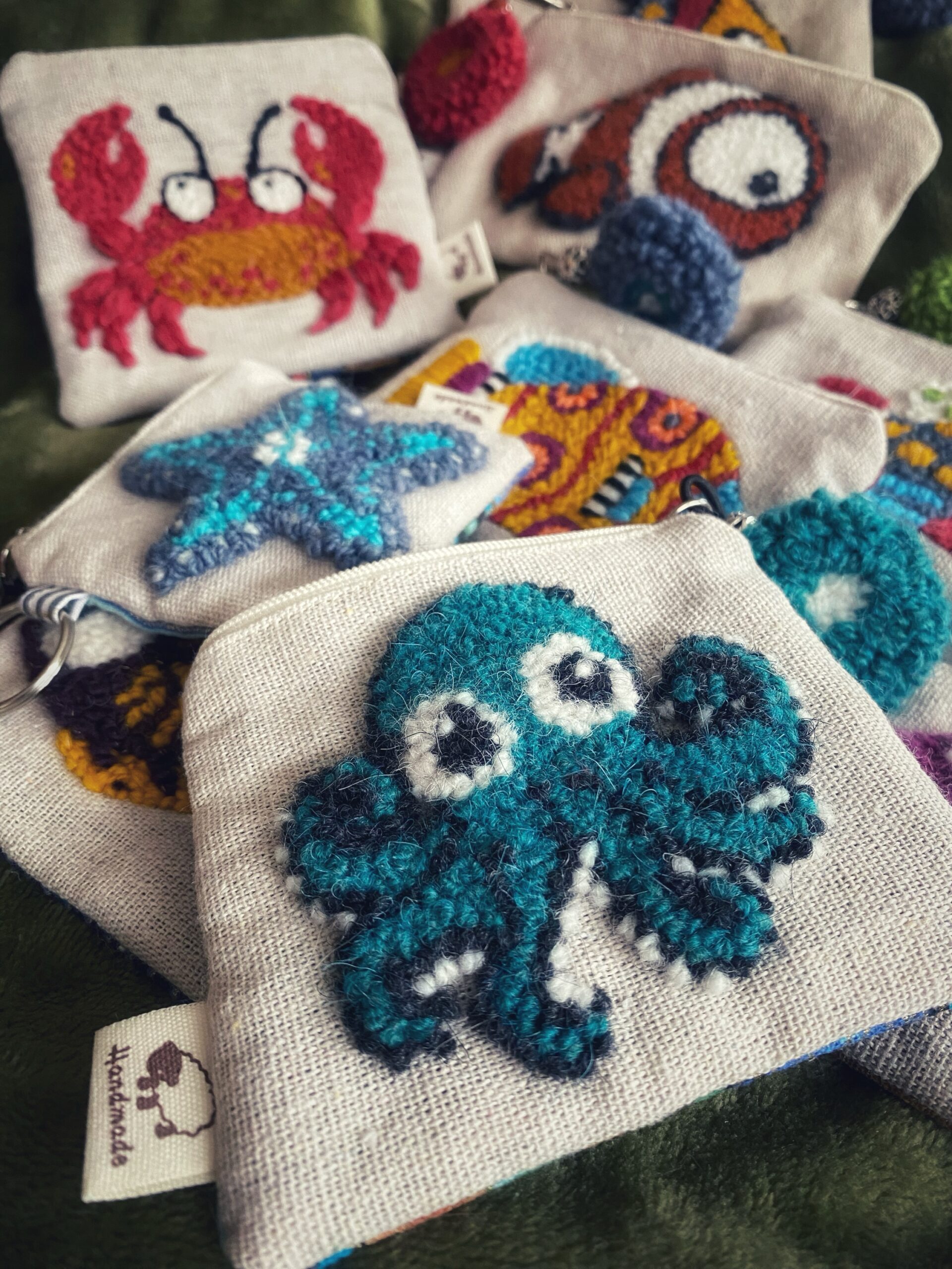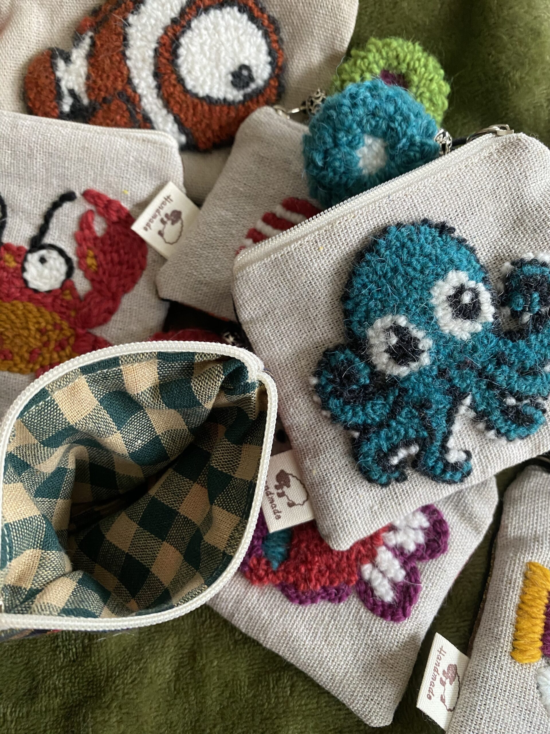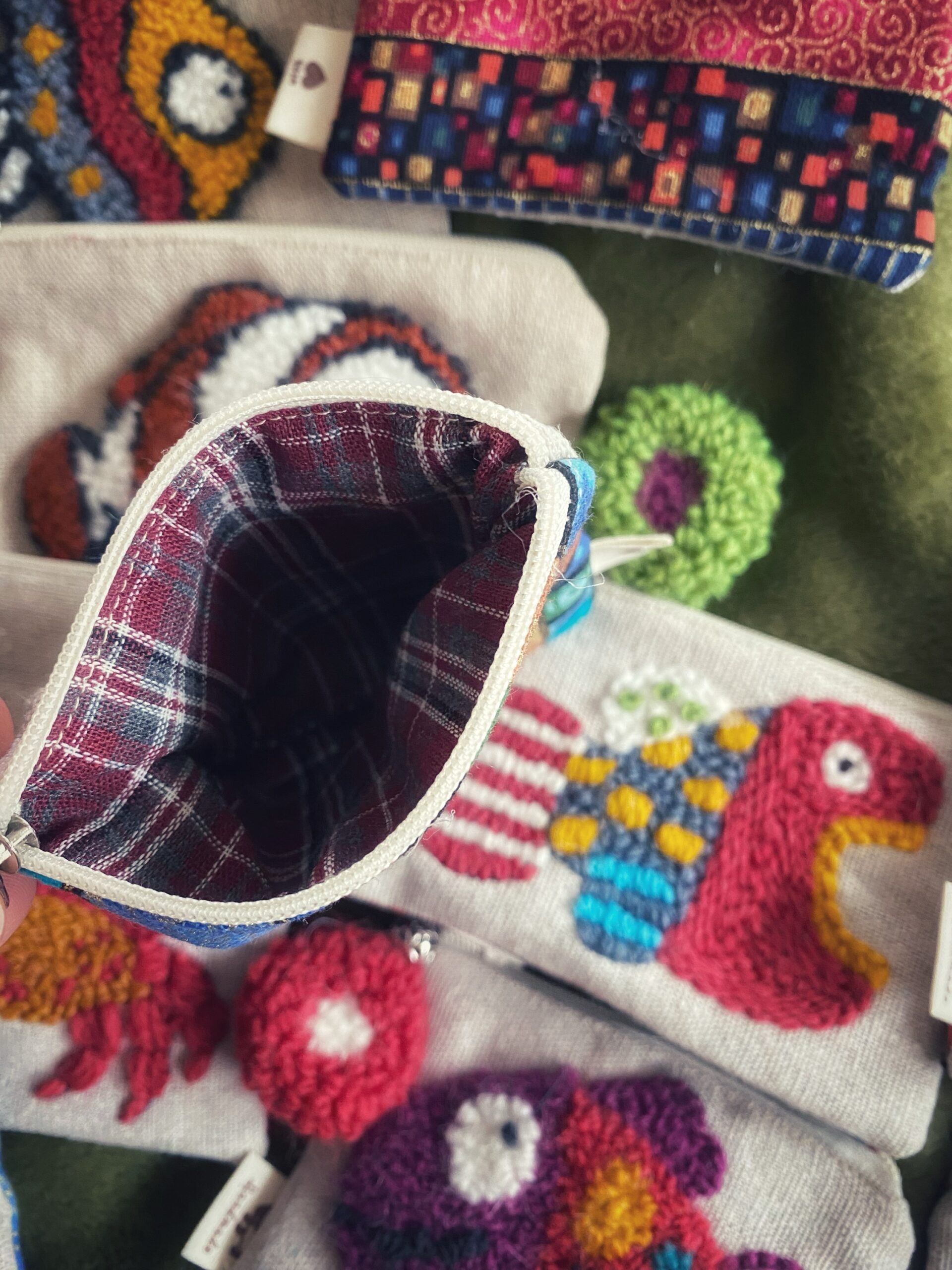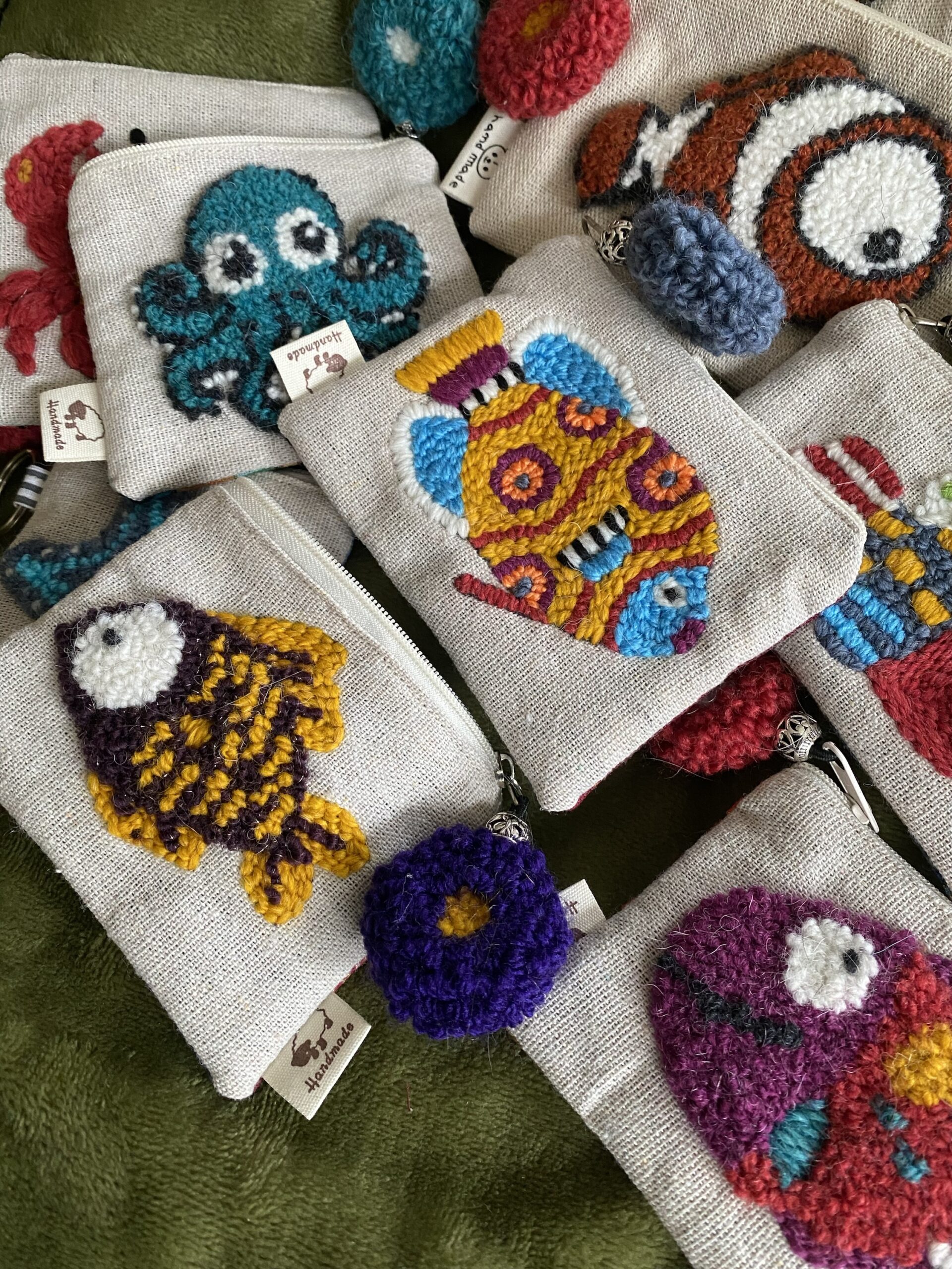 Piccola pochette in lana su tela in lino , ricamata secondo tecnica punch needle .