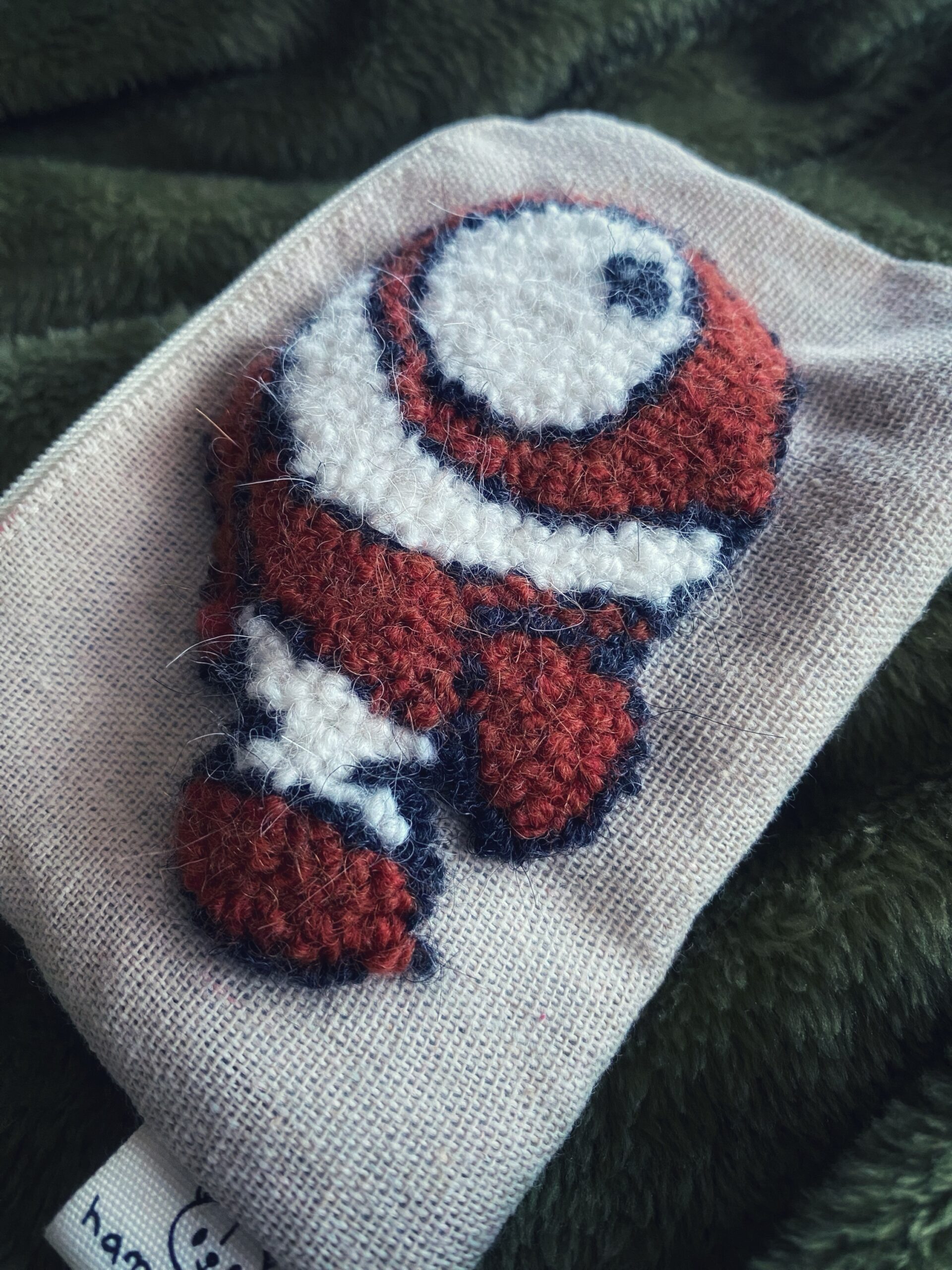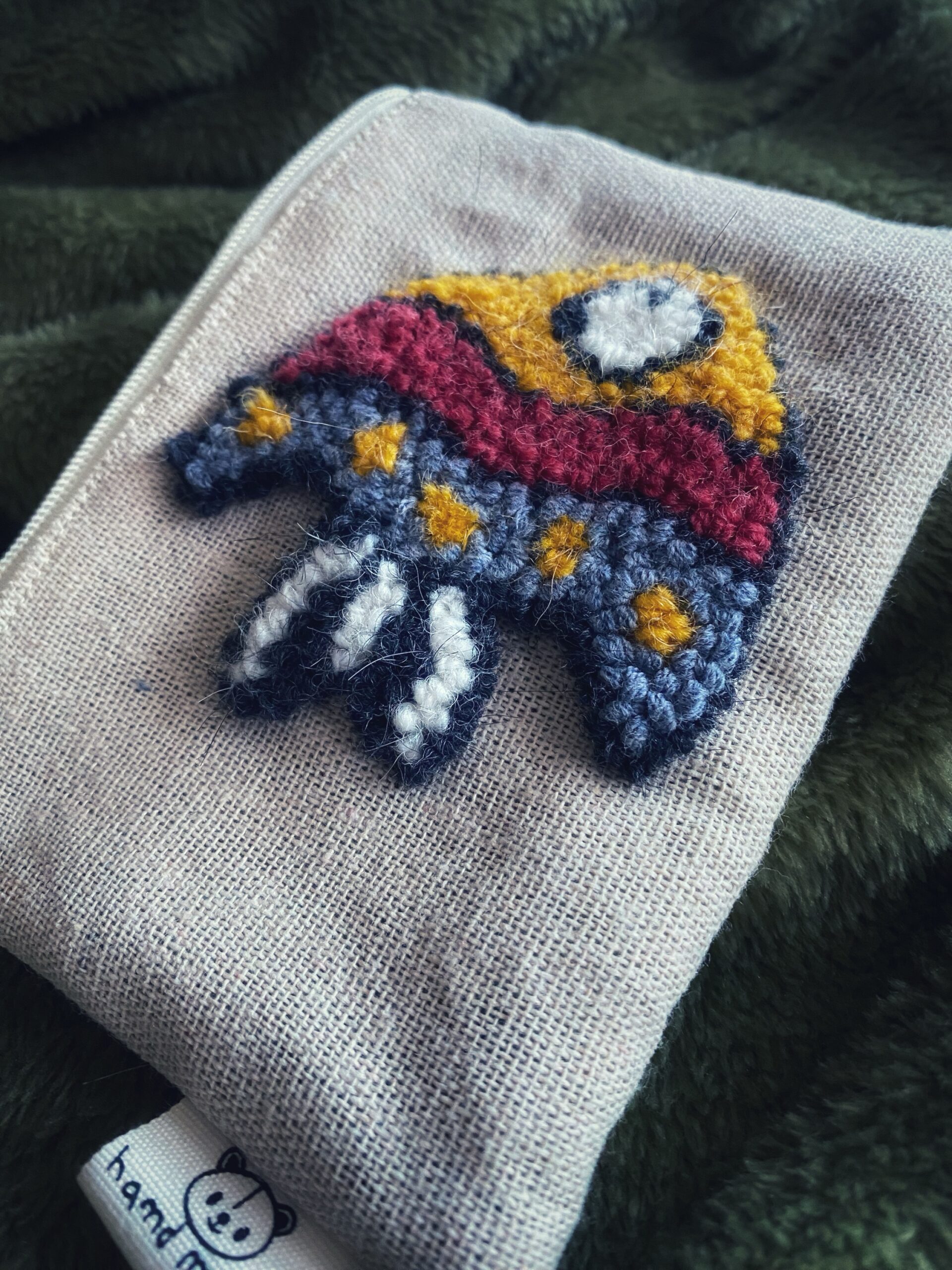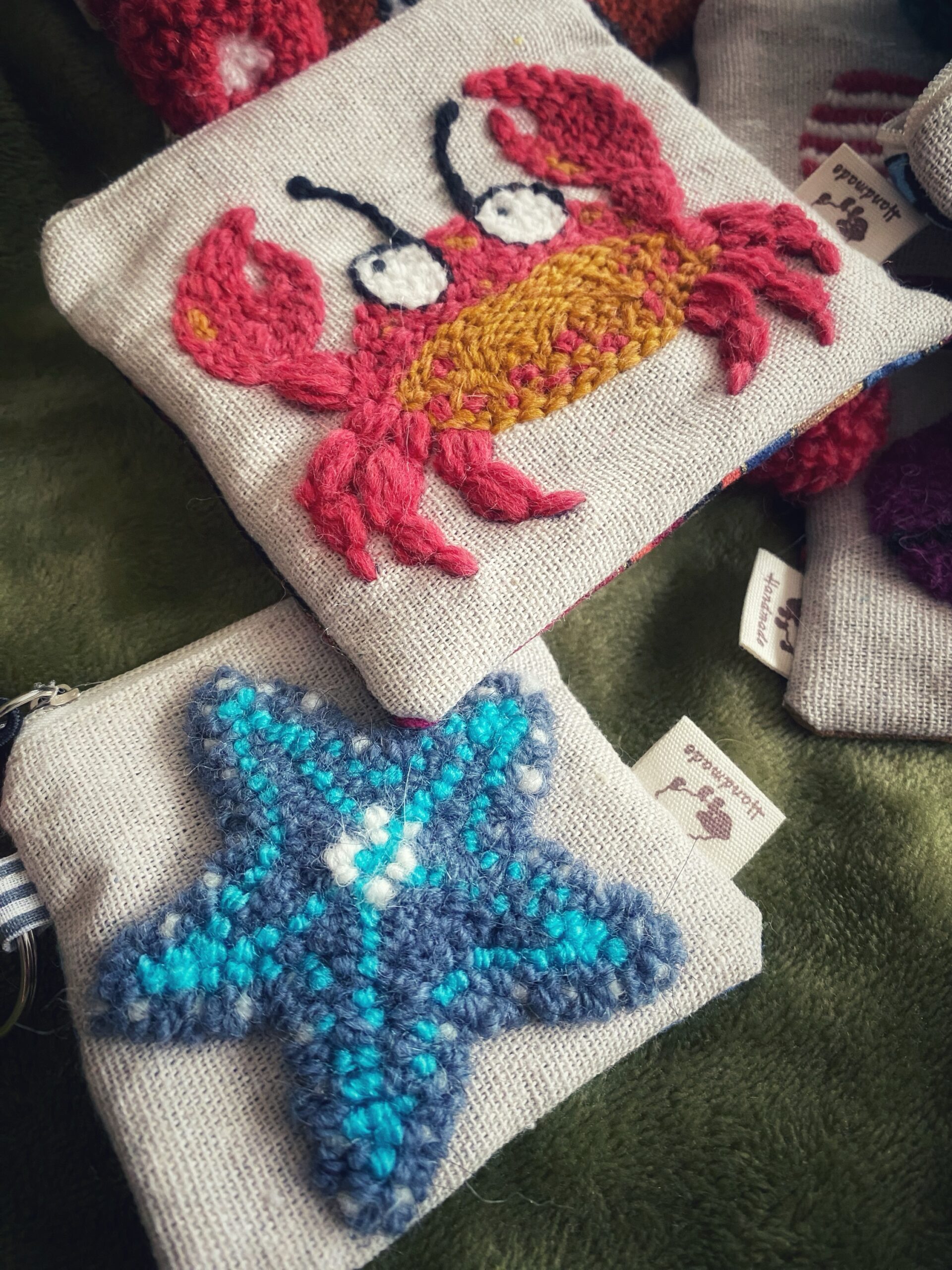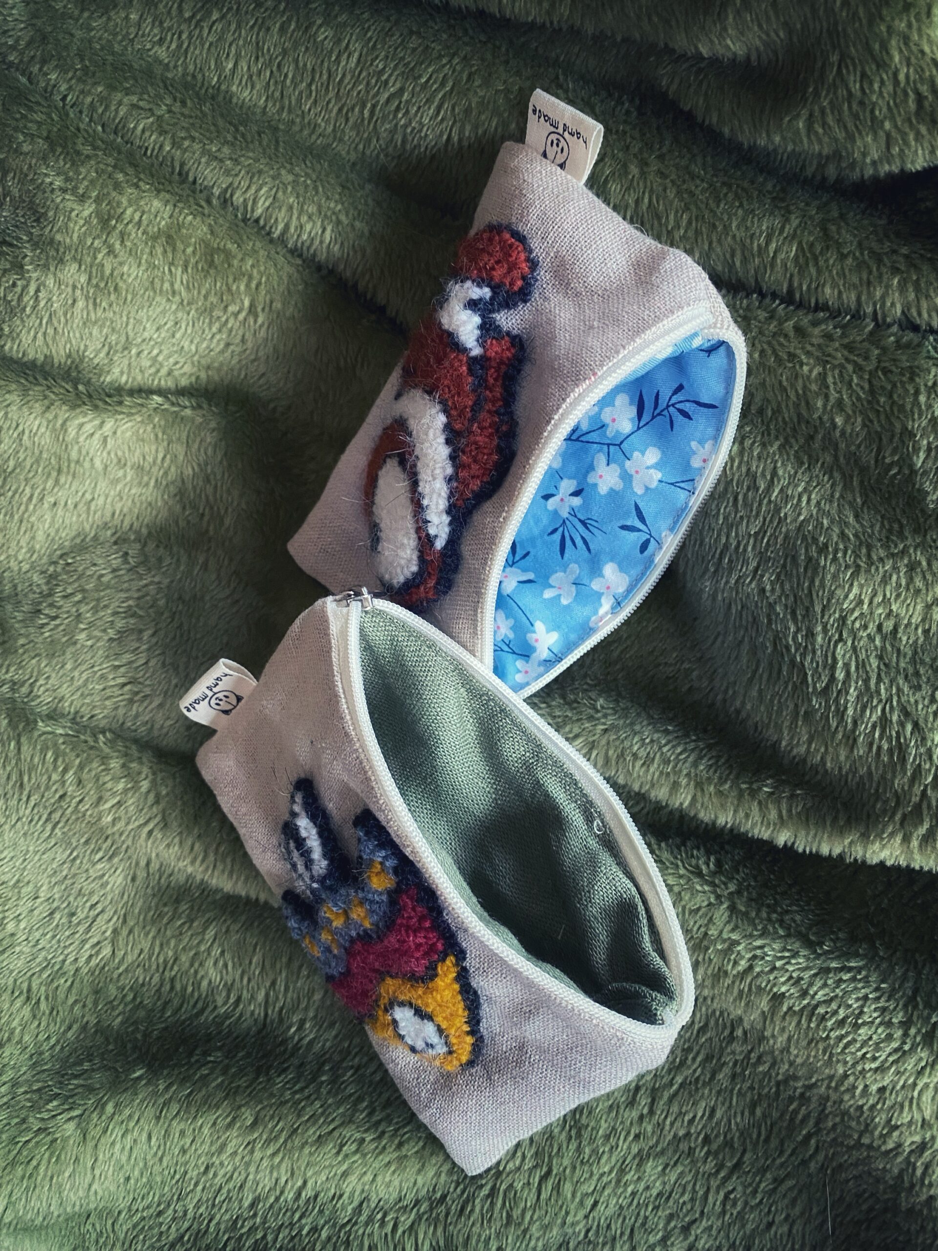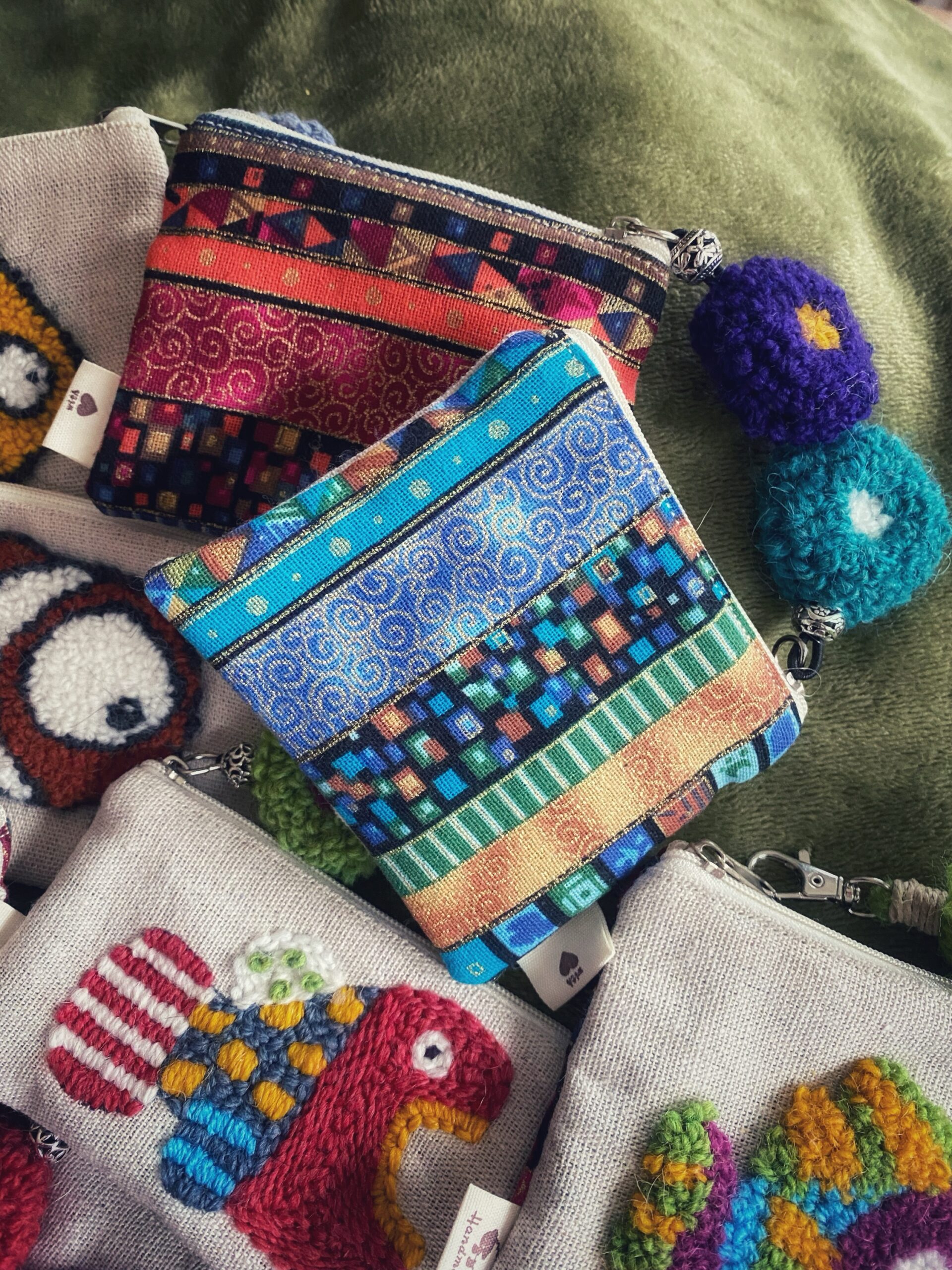 Piccola pochette in lana su tela in lino , ricamata secondo tecnica punch needle .