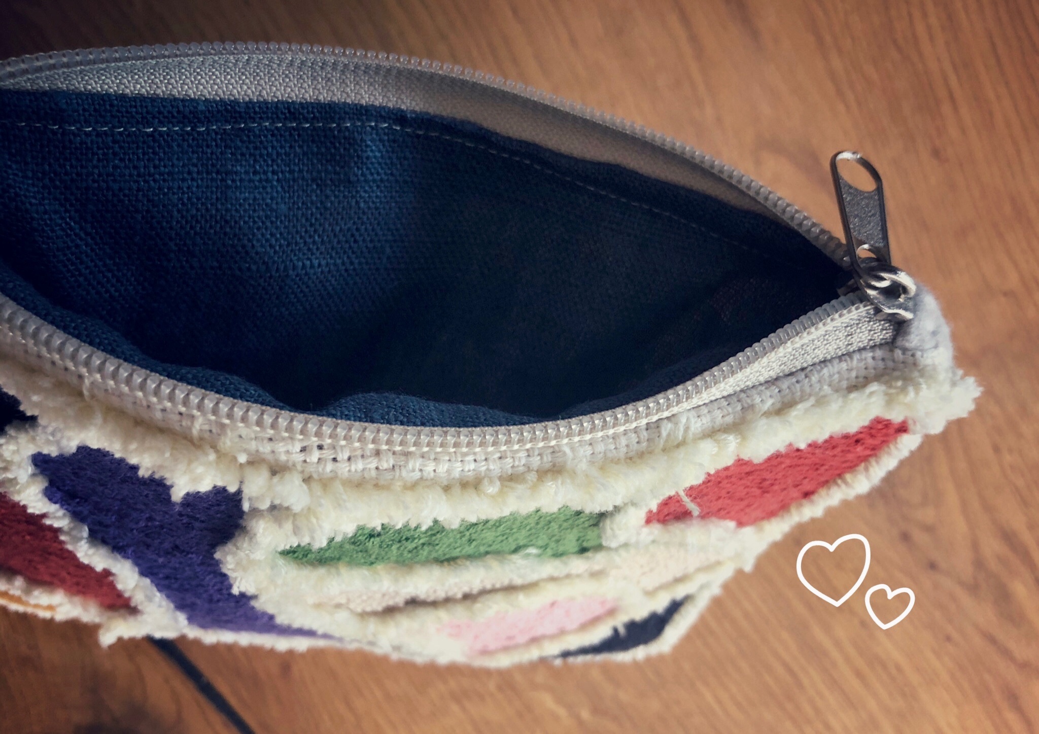 Astuccio con cerniera ricamato in lana su tela in cotone