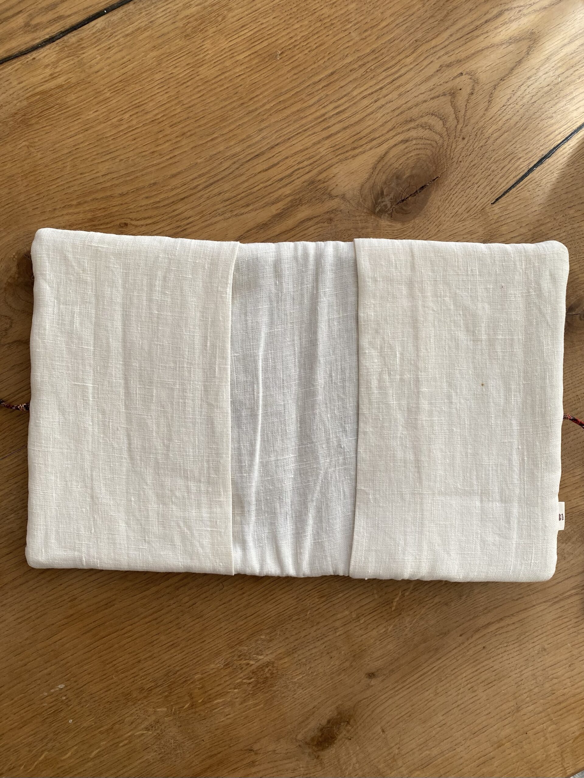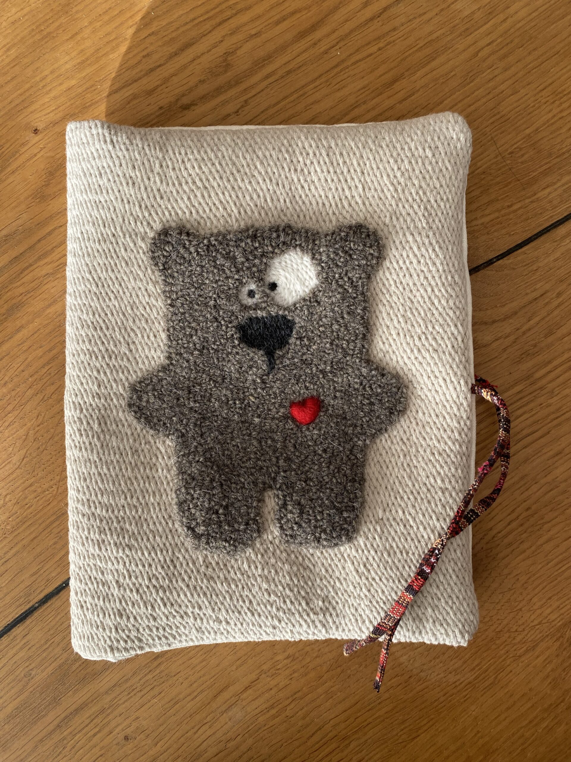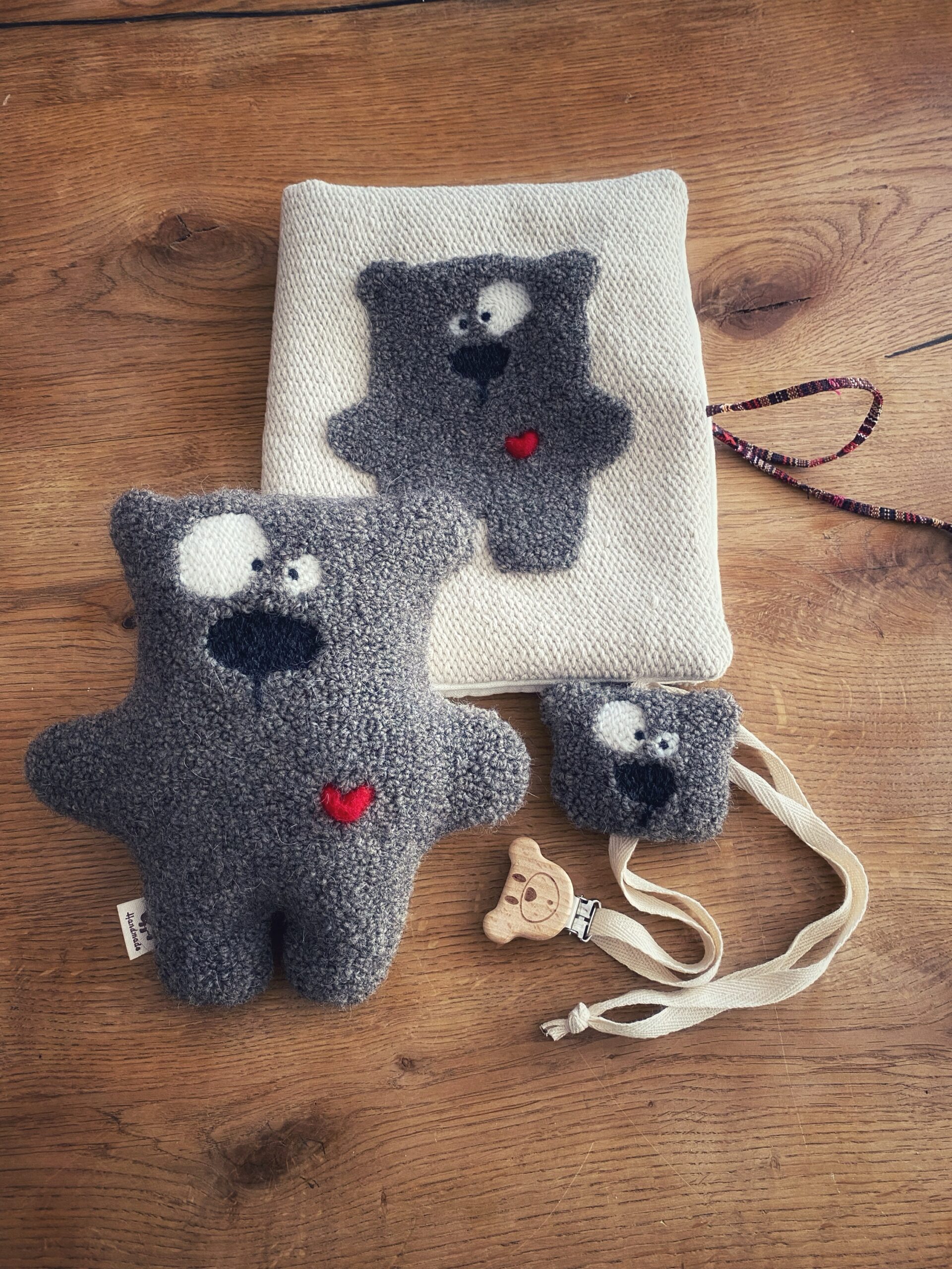 Porta pannolini, porta ciuccio e Joghi, ricamati e confezionati a mano in cotone e lana su tela di lino .