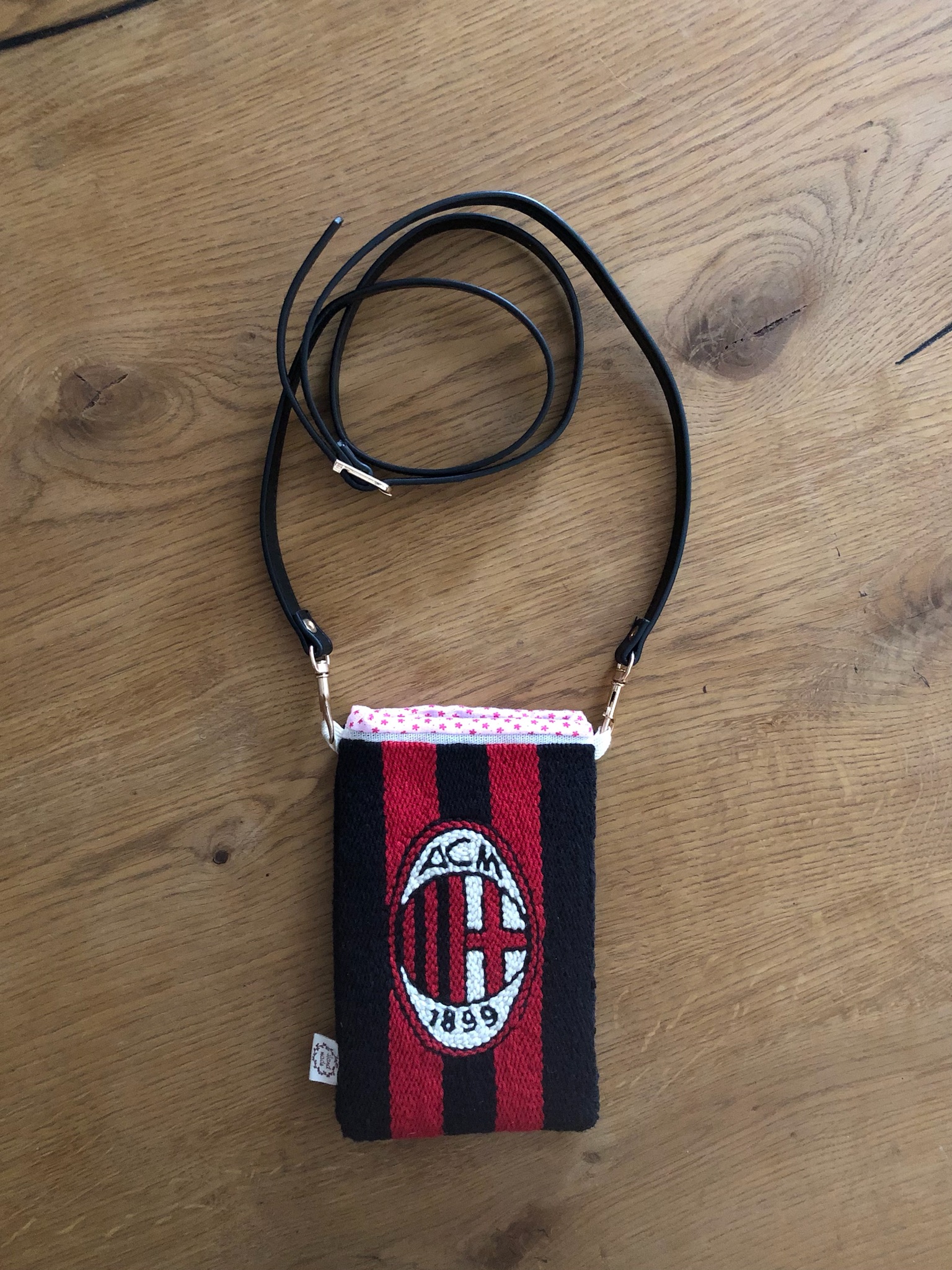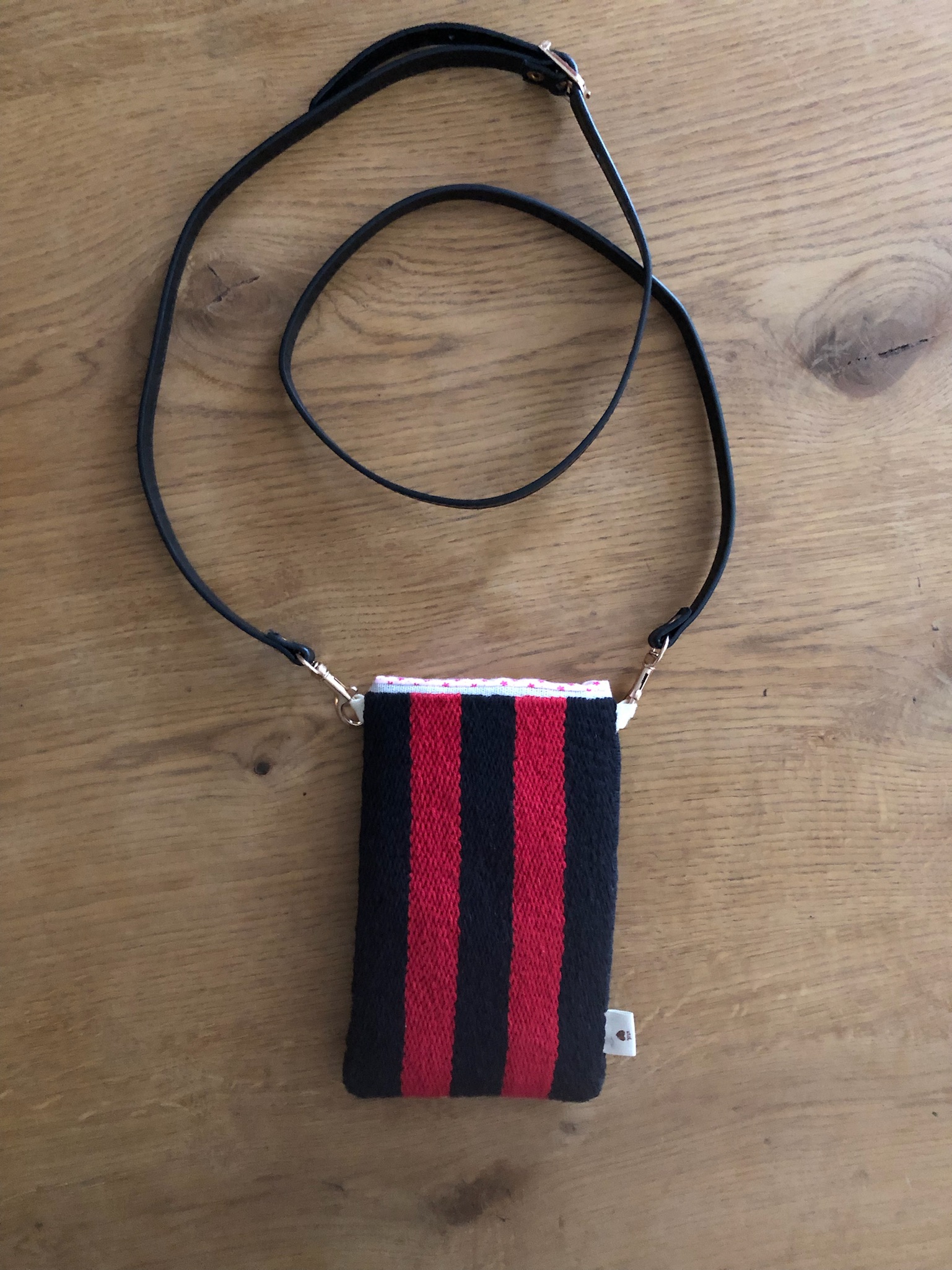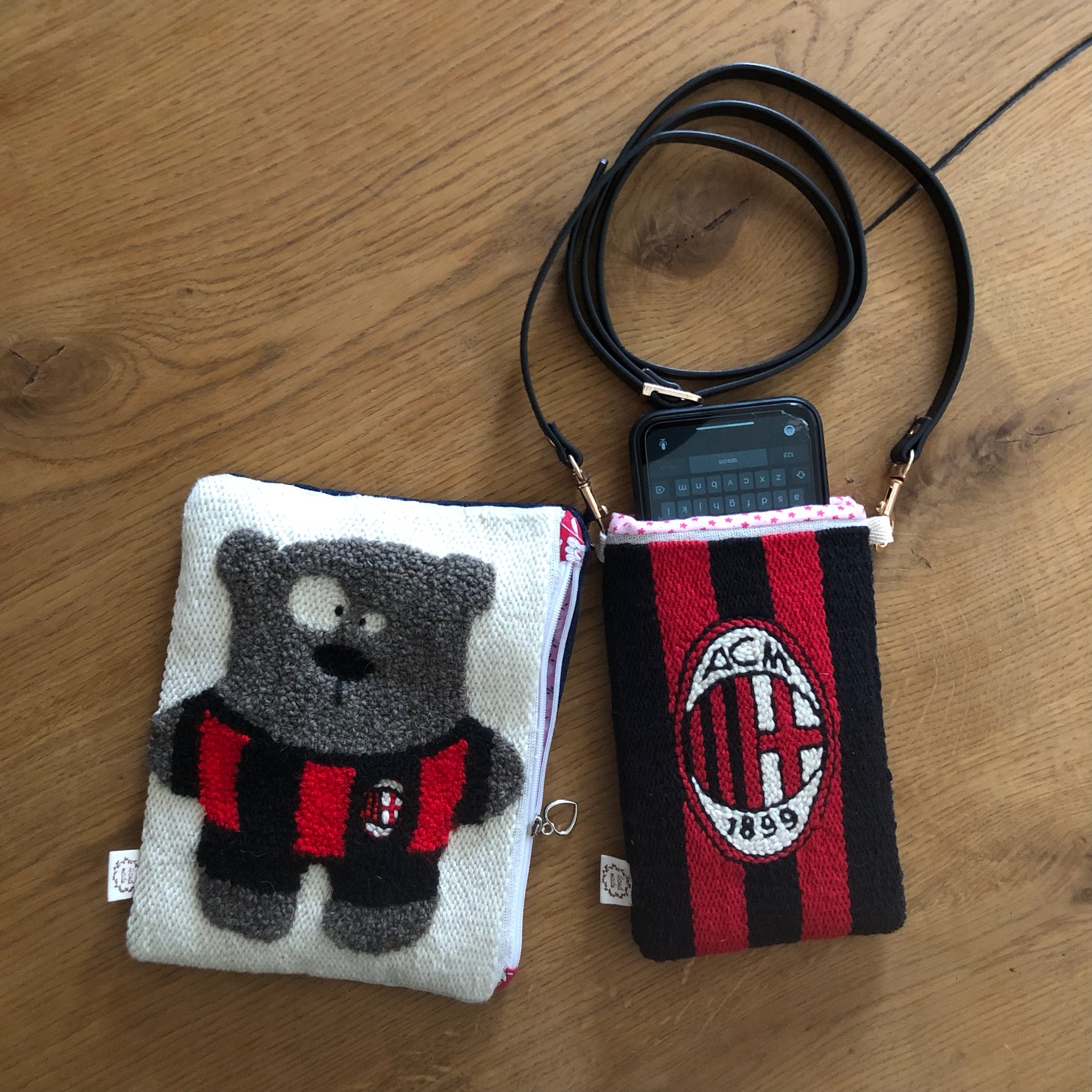 Astuccio e porta cellulare ricamati in lana su tela in cotone