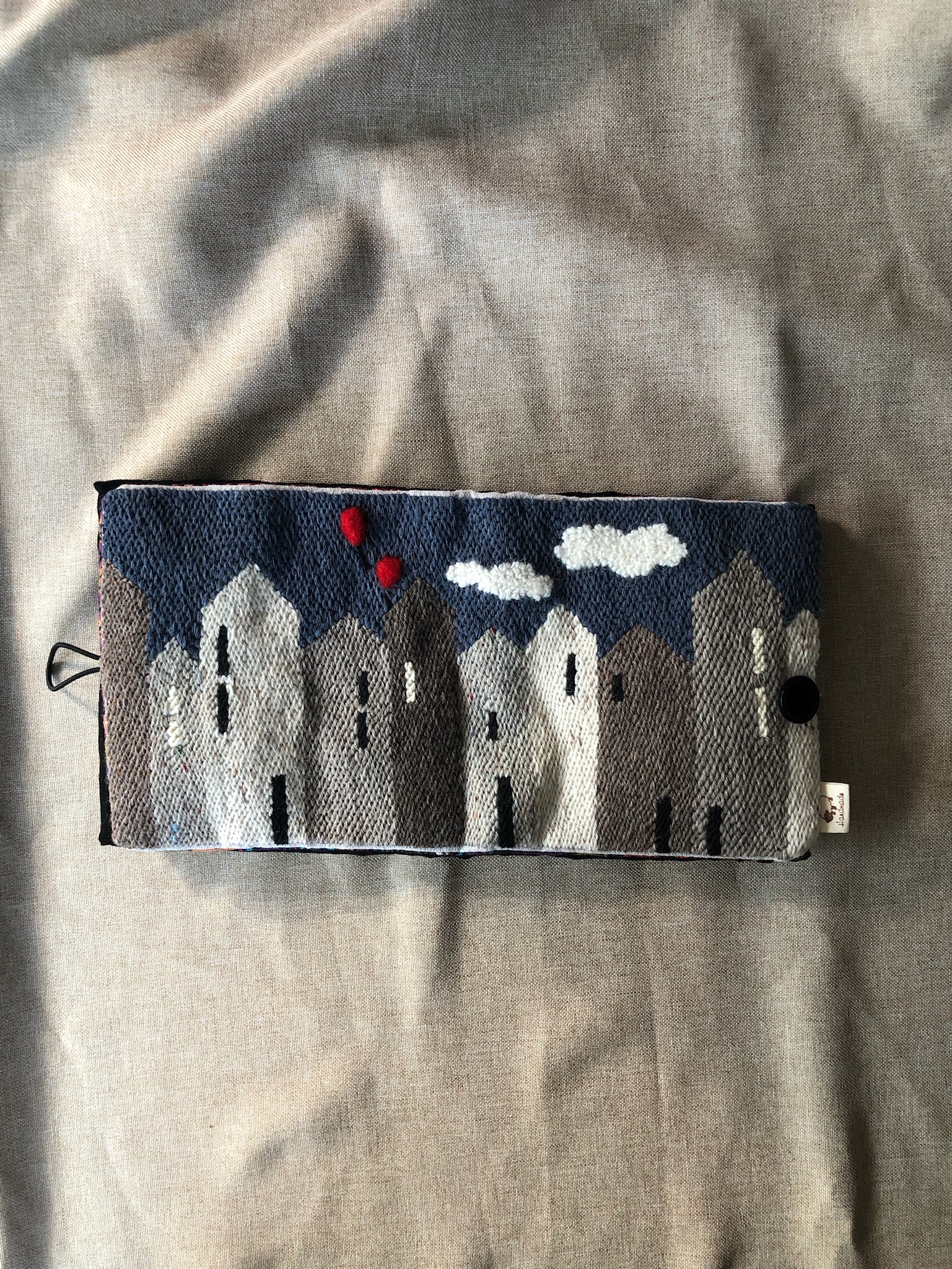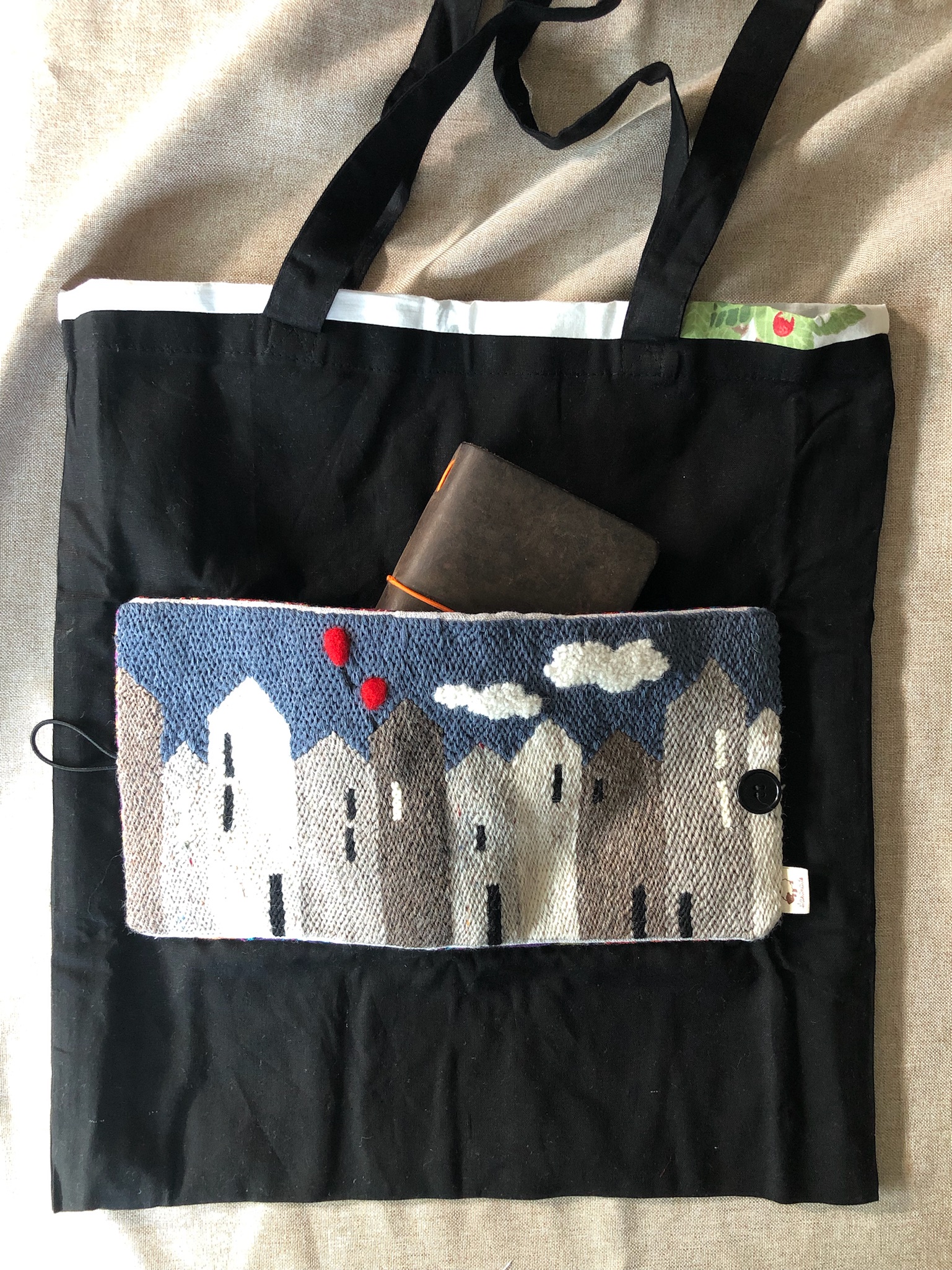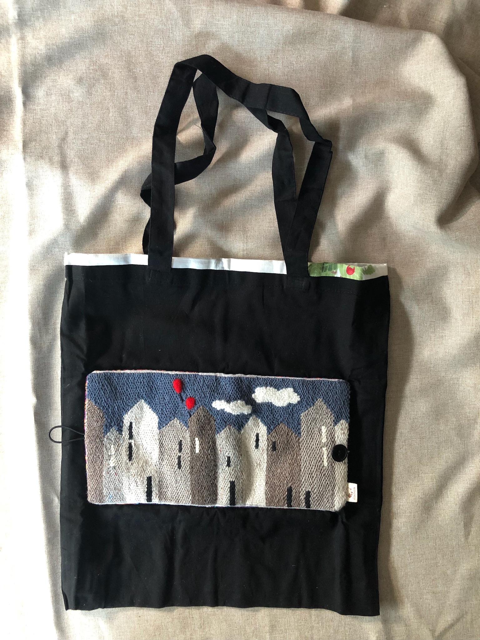 Borsa Tote BAG ripiegabile e ricamata a mano in lana su tela in busta di lino o di cotone.